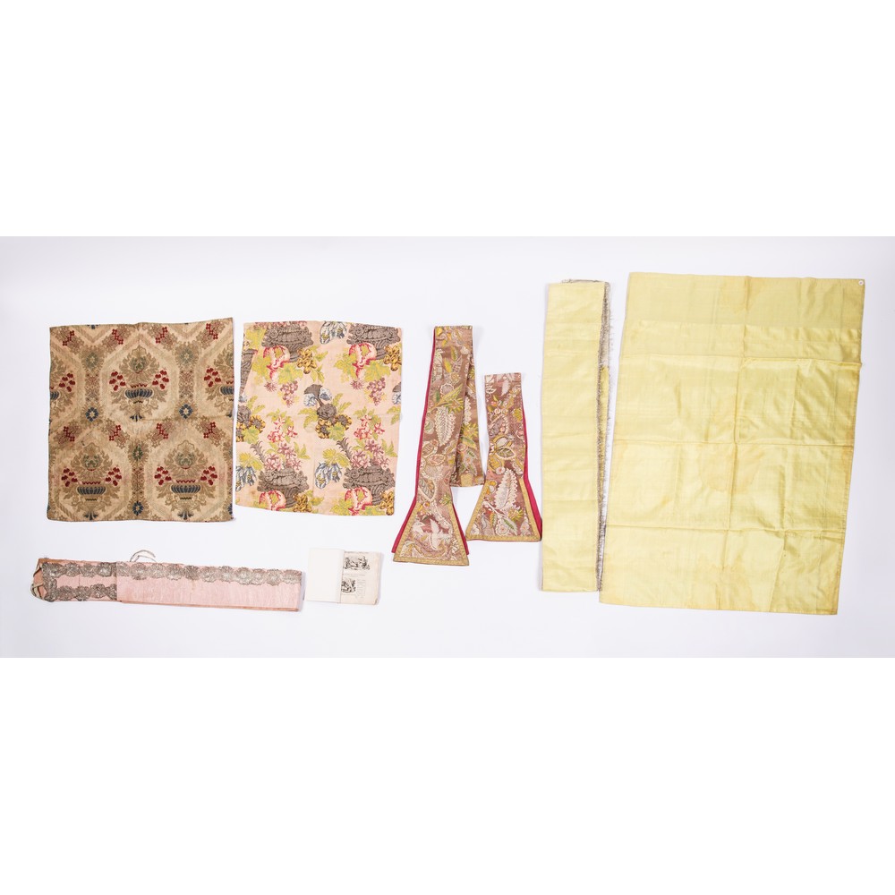 Una copertina e un fasciatoio in seta gialla con bordure argento, un fasciatoio in moirè di seta rosa con gallone a filo d’argento; due manipoli in broccato di seta a fondo oro. Due pezzi di broccato in seta a fondo avorio con fiori policromi.