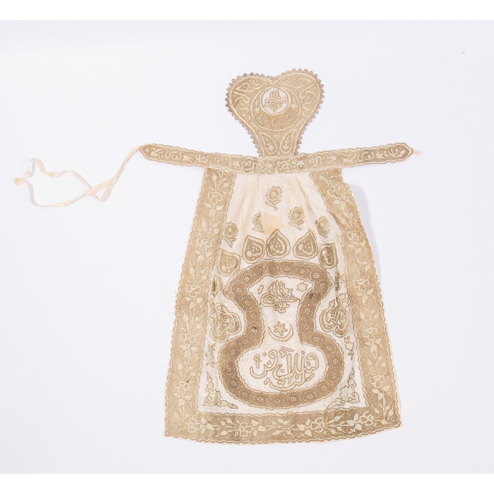 Antico grembiule ricamato in seta e oro, ricami sulla pettorina e nelle bordure a motivo floreale.