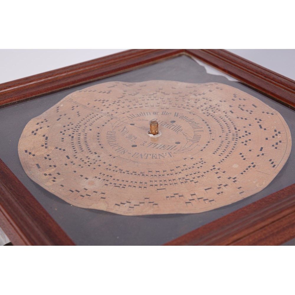 Cassetta musicale ad ancia di fabbricazione tedesca con lettura a disco di cartone forato. I fori del disco liberano dei saltarelli che per mezzo di levette permettono ai ventilabri di aprirsi e chiudersi.