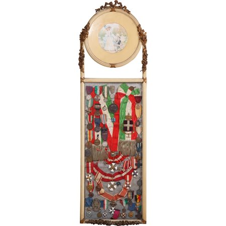 Una teca in legno laccata con medaglione circolare a scena galante contenente una collezione di circa cinquanta tra medaglie, decorazioni e ordini cavallereschi.
