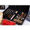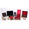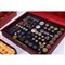 Una scatola rivestita in tela cerata con dorature nei bordi, l'interno è foderato In raso di seta e velluto color rosso cardinale, la chiusura è a chiavetta contiene sessantotto bottoni femminili e maschili.