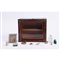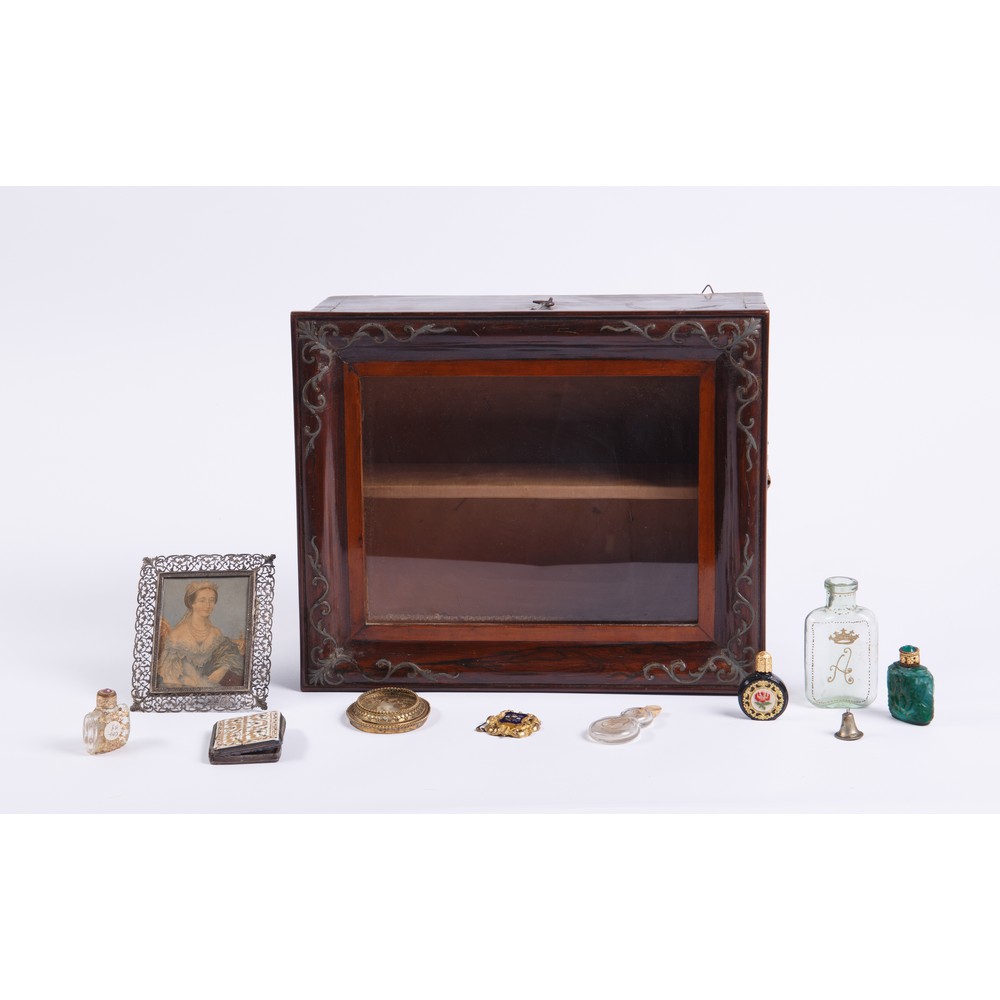 Una teca in legno contenente una raccolta di cinque antiche bottiglie per profumo, due miniature una raffigurante Eugenia di Montijio, una scatola in smalti a decori oro, una spilla con smalti blu e decori policromi a motivo floreale.