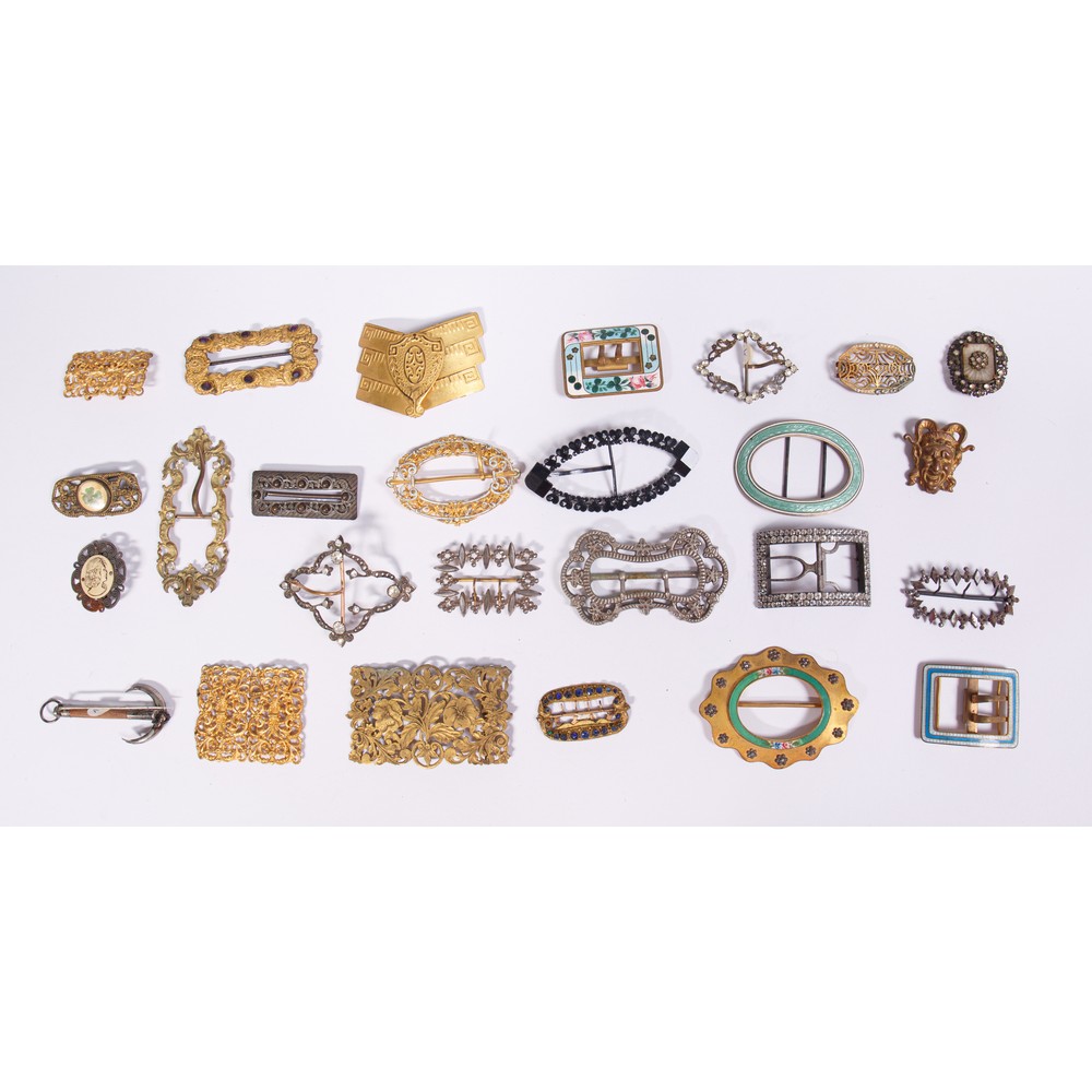 Una raccolta di venticinque fibbie in metallo dorato, metallo argentato, metallo e legno, smalti.