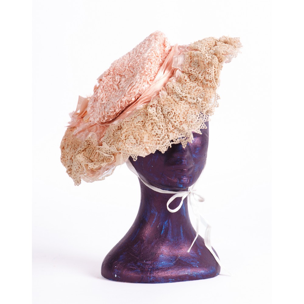 Raro cappello femminile da passeggio in raso di seta rosa a larghe falde totalmente ricoperte da trine avorio eseguite a mano.