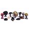 Una cappelliera contenente tredici cappelli da donna, sette in panno, due in velluto uno in lana e macro paillettes argento, un fiocco acconciatura in raso nero, una cuffia in cotone color vinaccia e fucsia.