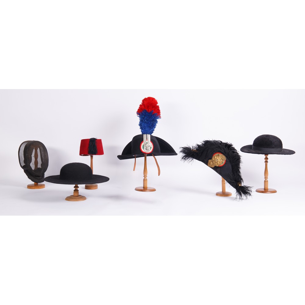 COLLEZIONE DI CINQUE CAPPELLI MASCHILI E DI UNA MASCHERA DA SCHERMA