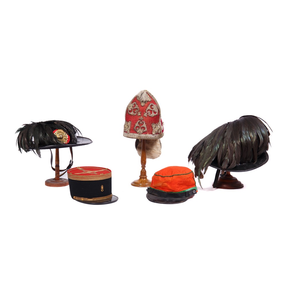 Un copricapo da granmontatura, cappello per divisa da Cadetto del collegio militare della Nunziatella e due copricapi da bersagliere e un berretto garibaldino.
