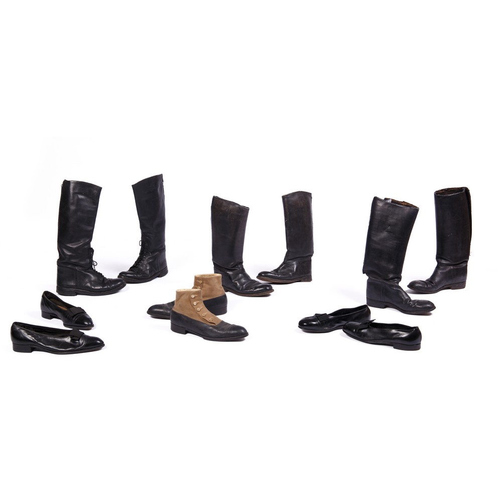 Sei paia di scarpe da uomo, tre paia di stivali in pelle nera, due paia di scarpe da sera, un paio di stivaletti neri con abbottonatura laterale.