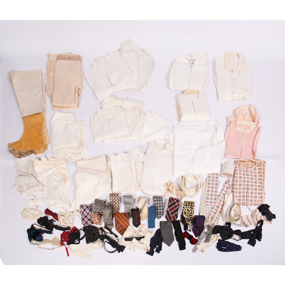 Una raccolta di 67 pezzi di abbigliamento maschile composto da diciassette cravatte, ventidue papillon, otto jabot, quattordici camicie da notte maschili, cinque mutandoni e colletti vari.