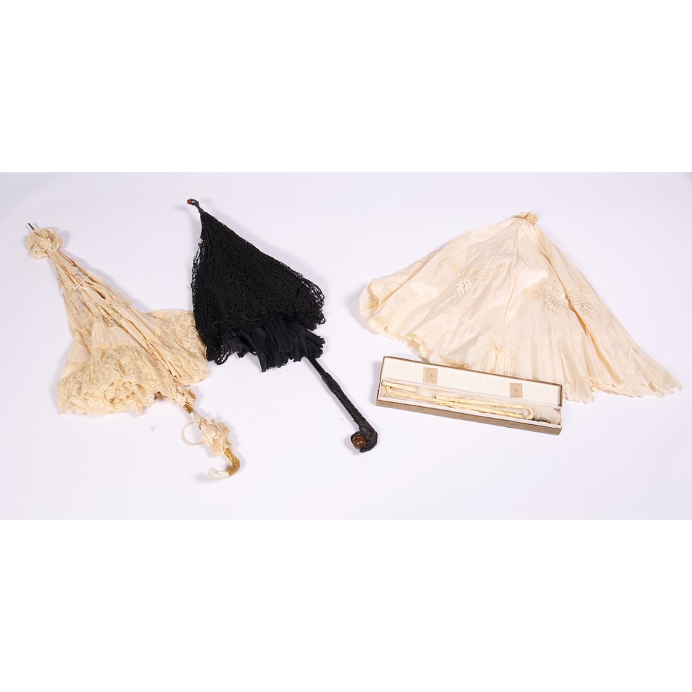 2 OMBRELLI, MANICO CON SCATOLA E UNA COPERTURA PER OMBRELLO EPOCA XIX E XX SEC.