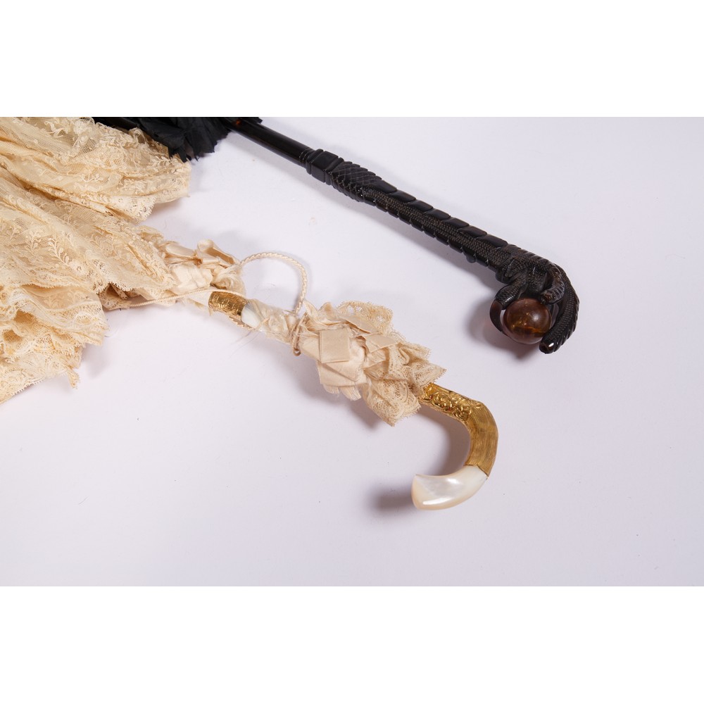 Importante ombrello in seta e pizzo, fusto in metallo, manico in madreperla e metallo dorato, stecche in metallo, copertura in seta color avorio dipinte a motivi floreali bordato in pizzo crema, punta in metallo.