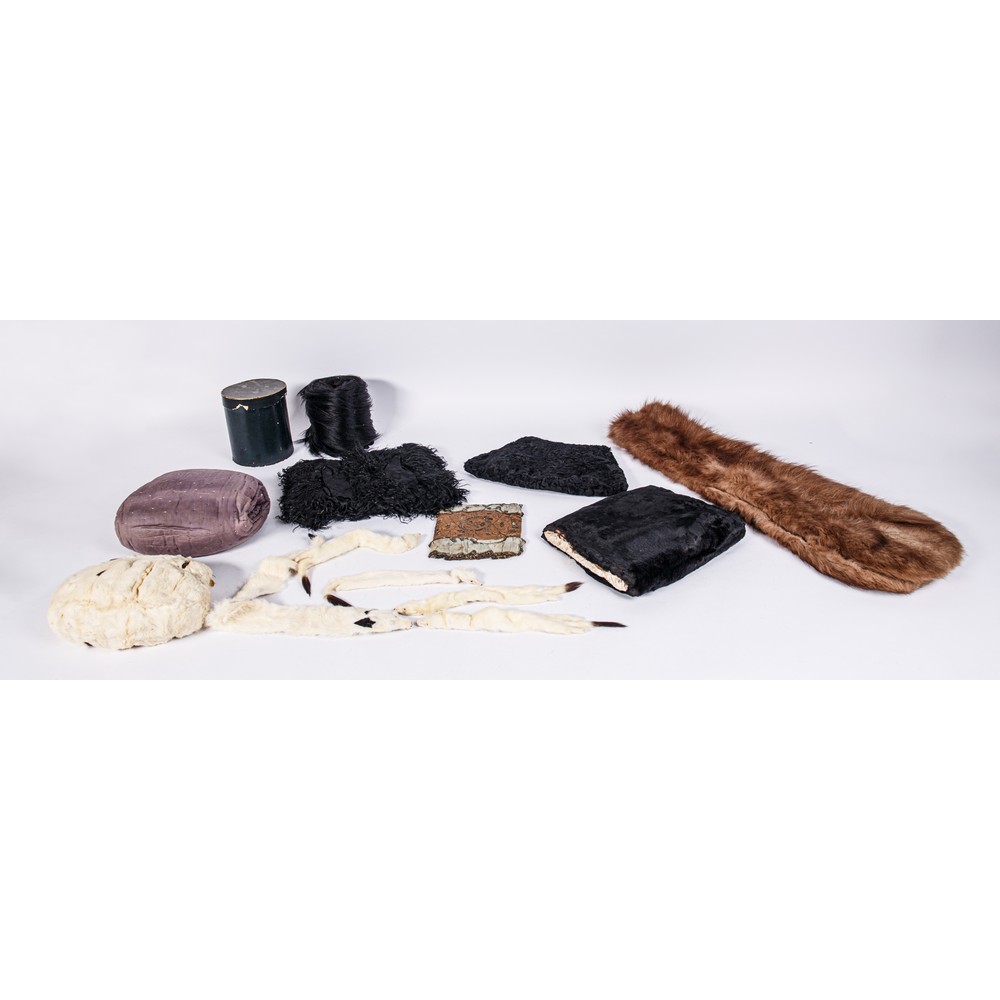 Un manicotto da passeggio prima meta del 1700; un manicotto in ermellino; uno con imbottitura del 1701; uno in astrakan nero ,un manicotto in pelliccia di Mongolia nera; cinque ermellini; una volpe a stola anni 1940; un manicotto in raso di seta interamente rivestito di pelo di cane (acchiappa pulci) 1870.