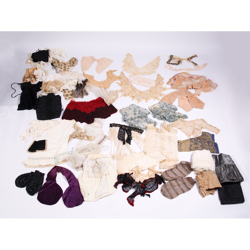 UNA RACCOLTA DI DICIASSETTE PEZZI IN TESSUTO e colore differenti, in pizzo e ricami così suddivisi: nove jabot ,quattro colli ,un completo colli e maniche, una coppia di maniche dell’ottocento una coppia di polsini.