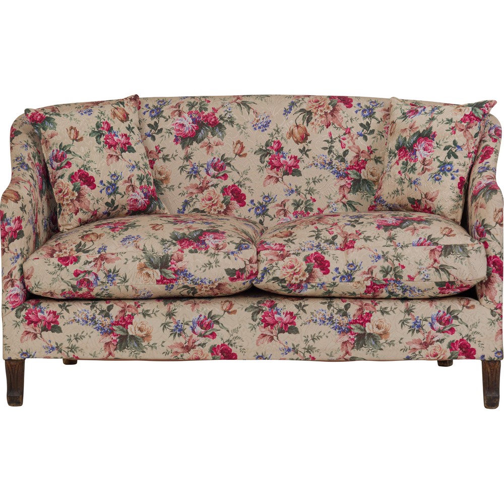 DIVANO due posti in tessuto, con tappezzeria a motivo floreale e fogliaceo.