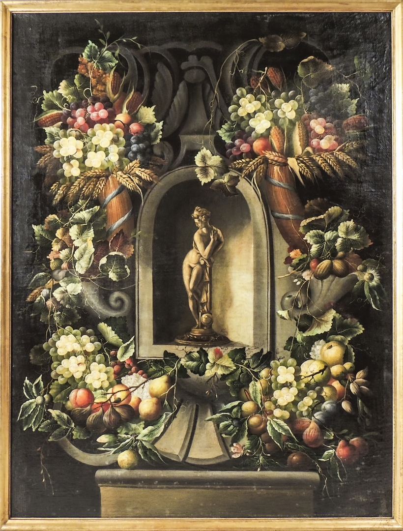 TRIONFO DI FIORI E FRUTTA CON SCULTURA CLASSICA olio su tela, in cornice cm 120x90