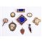 cinque SPILLE, due PENDENTI di diversa tipologia, PORTA ROSSETTO e PORTA CIPRIA in metallo dorato e smaltato.