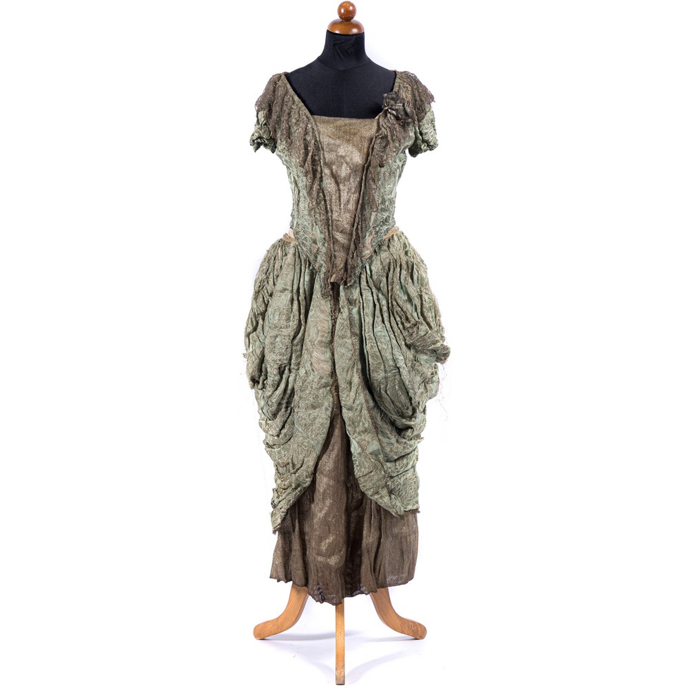 Manichette a palloncino in analogo tessuto. Tutto il busto è contornato da un ampio bordo di pizzo in filo d'argento puntellato sul lato destro da un grosso fiore in filo d'argento. Gonna in Lamè dal taglio molto frangiato è arricchita da due grosse bande di taglio settecentesco realizzato in broccato, duepaners laterali sui fianchi. La fodera è in seta. L'abito è chiaramente di ispirazione settecentesca ma si attribuisce a quei momenti scapigliati della moda generatasi tra gli anni 1850-1870.