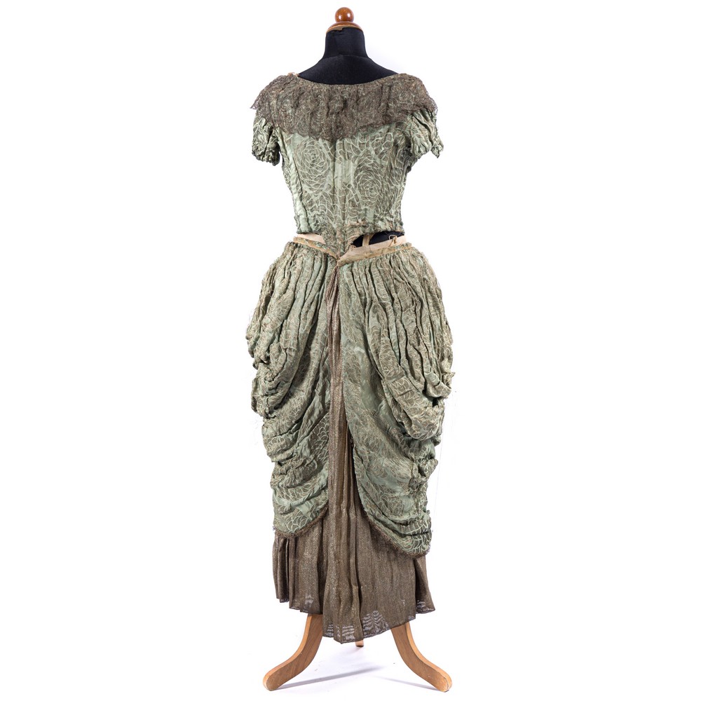 Abito in due pezzi in broccato verde antico e oro. Busto dal vitino a vespa a punta calata e fermato sul frontale da stecche con chiusura a ganci e da un bordo di pettorina in lame.