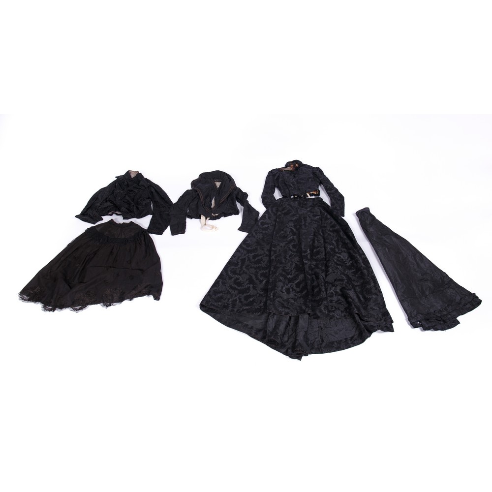 ABITO DA LUTTO IN TRE PEZZI ,UNA MANTELLINA NERA IN PIZZO E DUE GIACCHINI NERI RICAMATI EPOCA FINE XIX SECOLO