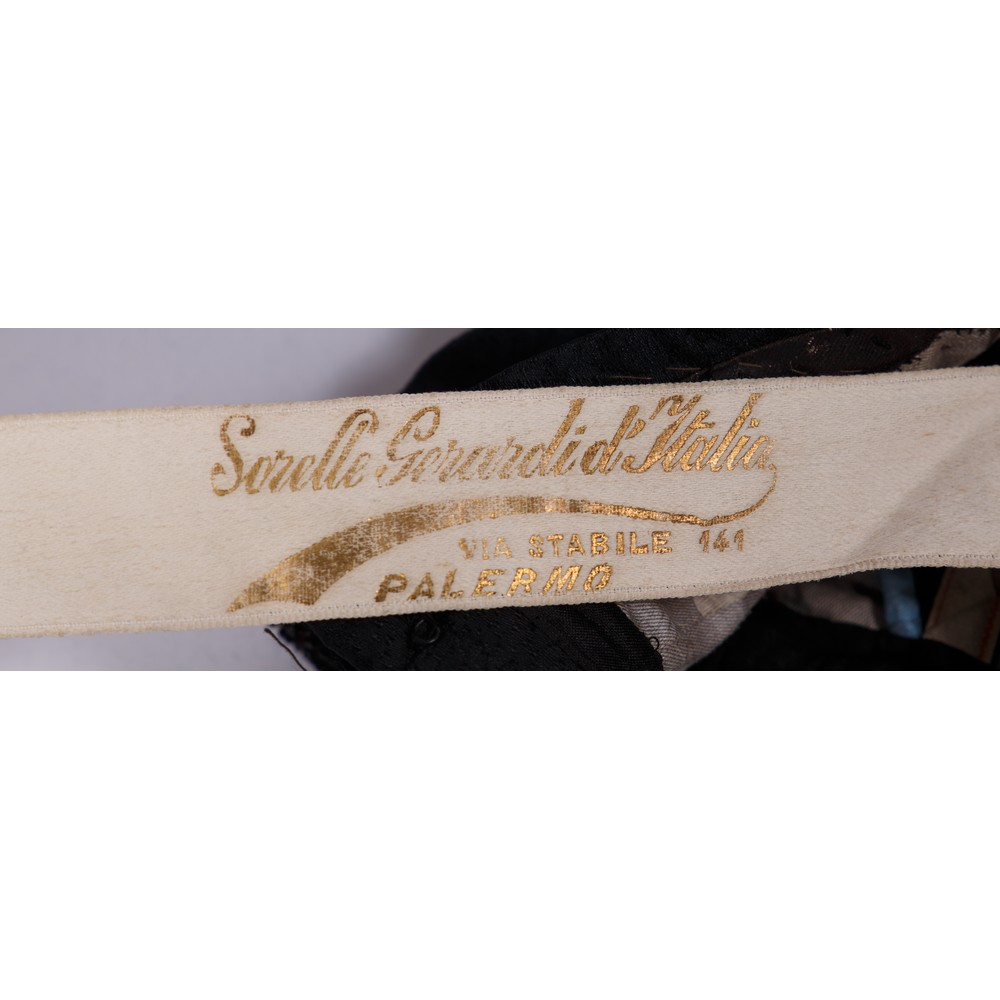 Abito da sera in due pezzi in raso di seta color nero operato a motivi floreali, corpetto con chiusura frontale, due maniche con piccoli sbuffi, colletto con fascia e due piccoli revers.