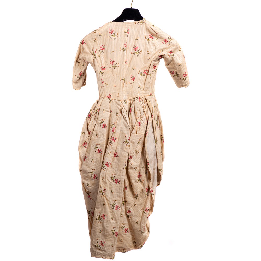 Corpetto di abito femminile da mattina in cotone operato a strisce verticali ed decorato a stampini con piccoli mazzetti di fiori nei colori rosso fucsia e giallo. La chiusura frontale è fornita di sedici ganci. La fodera è in cotone ed organza. Fornito di stecche di balena, allacciata al punto vita una grande coda a piegoni piatti e sbuffanti. Sui fianchi il tessuto si rigonfia plissettato, atto a contenere i paniers. Manifattura siciliana. Epoca 1780.