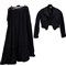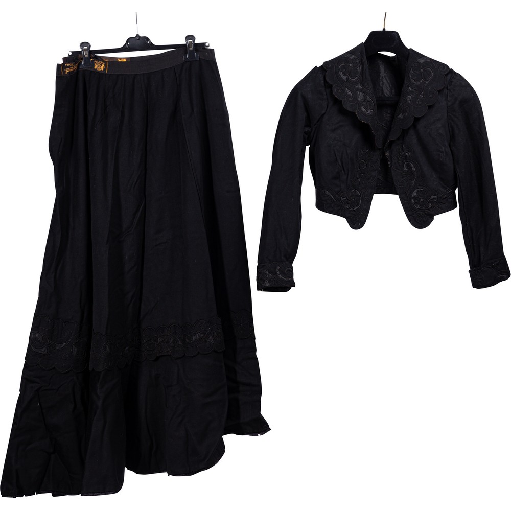 Elegante abito da sera invernale in fustagno color nero, chiusura frontale è arricchita da un colletto intagliato a motivi floreali con inserti di seta color nero ed orli in filo di seta color nero, con un taglio a calice, nella parte terminale movimentata da una balza in analogo ricamo. Epoca 1910.
