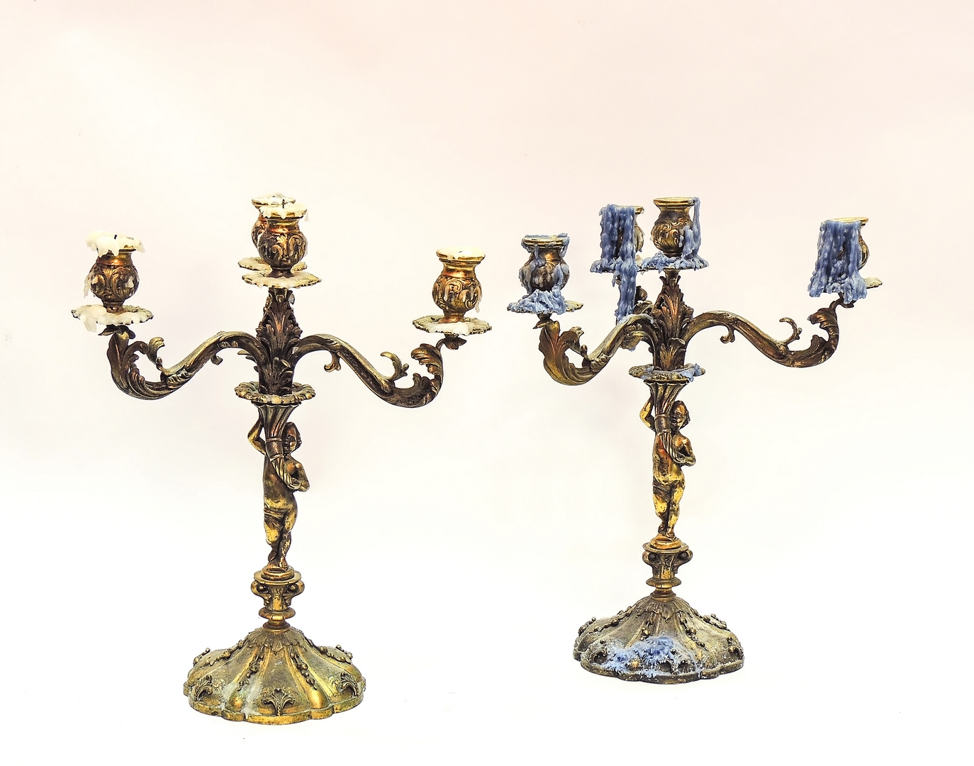 COPPIA DI GRANDI CANDELABRI IN ARGENTO VERMEILE Anni Trenta realizzati in stile rococò, ciascuno con putto che sostiene tre bracci portacandelee a doppia voluta ed uno centrale con bobeche cesellate, base polilobata sbalzata con ghirlande di frutta gr 4230