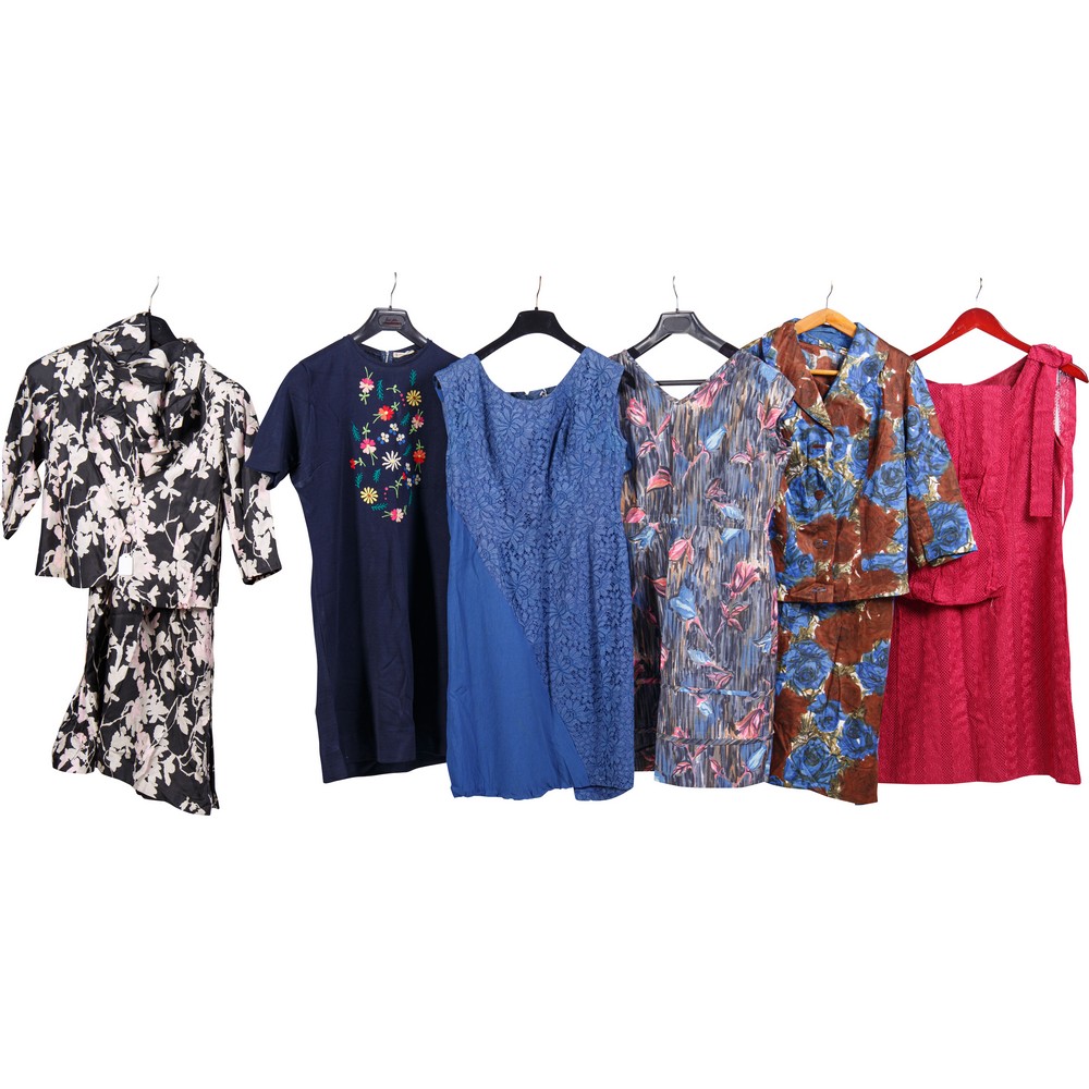 Un abito con giacca a fondo nero e fantasia a fiori rosati; abito a mezza manica blu con ricami a fiori sul petto, un abito smanicato in tessuto e pizzo blu; un abito smanicato con collo a V grigio con fiori rosa e celesti; abito e giacca cin grandi rose azzurre e marroni; abito e stola in cotone operato rosso.