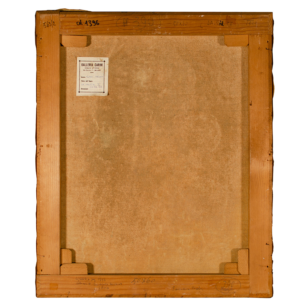 Opera accompagnata da autentica su fotografia con numero d’archivio 390 firmata dall’artista; opera accompagnata da attestato di provenienza della Galleria delle Ore firmato da Ermes Meloni in data: 8/4/93.