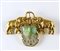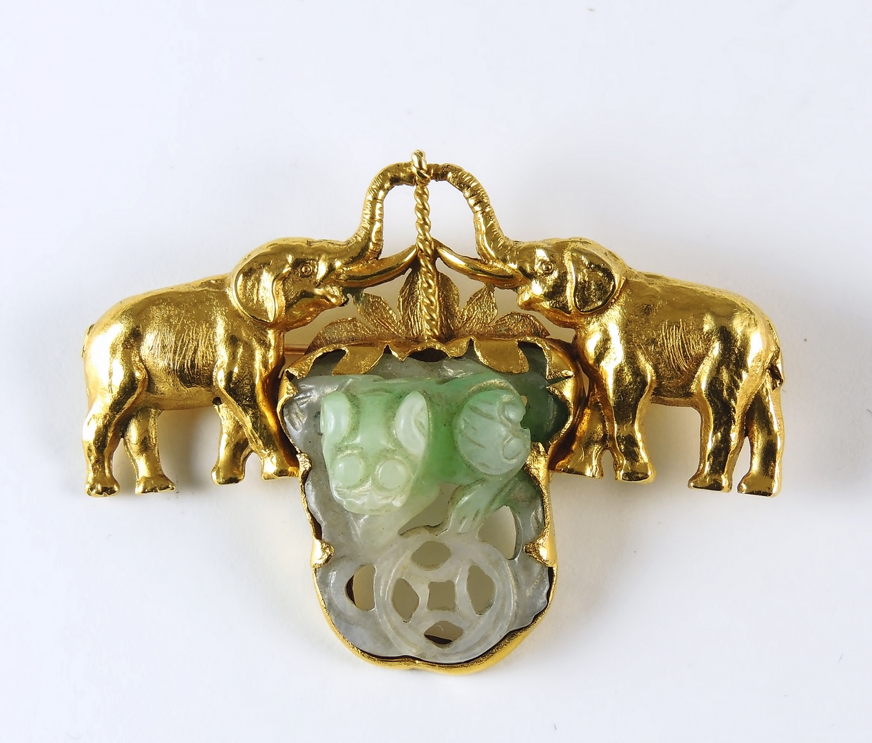 SPILLA IN ORO GIALLO E GIADA Anni Sessanta realizzata come due elefanti con la proboscide alzata che incorniciano una piccola placca in giada intagliata come un cane di Pho gr 29,7 lordi