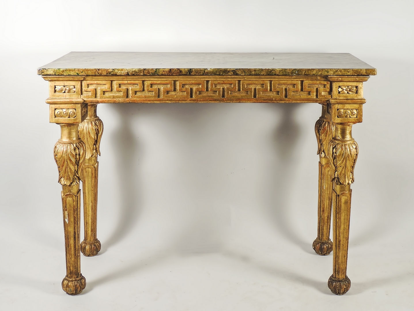 CONSOLE IN LEGNO INTAGLIATO E DORATO pendaglina intagliata con motivo a greca, gambe a faretra scanalata con attacco a foglia d'acanto, piano dipinto a finto marmo, realizzata con antichi frammenti h cm 90x120x47