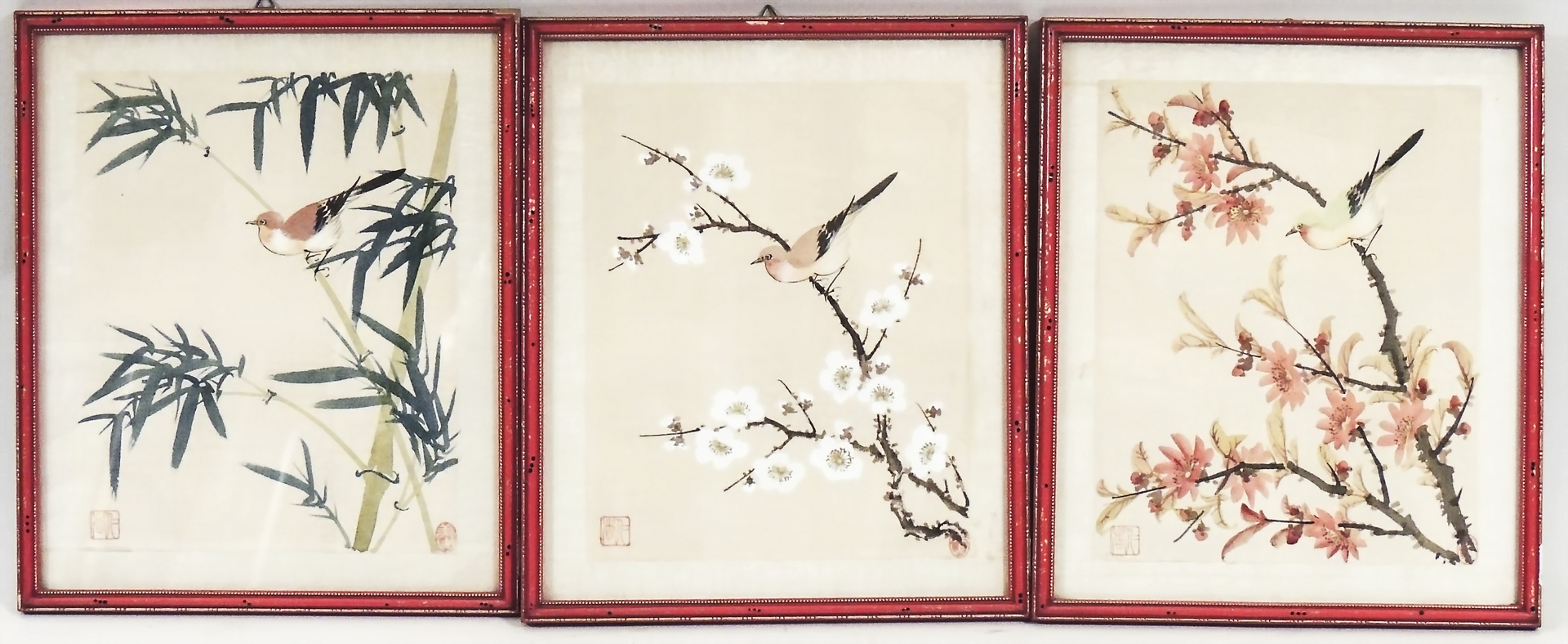 SERIE DI SEI DIPINTI SU SETA Cina, inizio del XX secolo raffiguranti fiori ed uccellini, in cornice cm 25x20