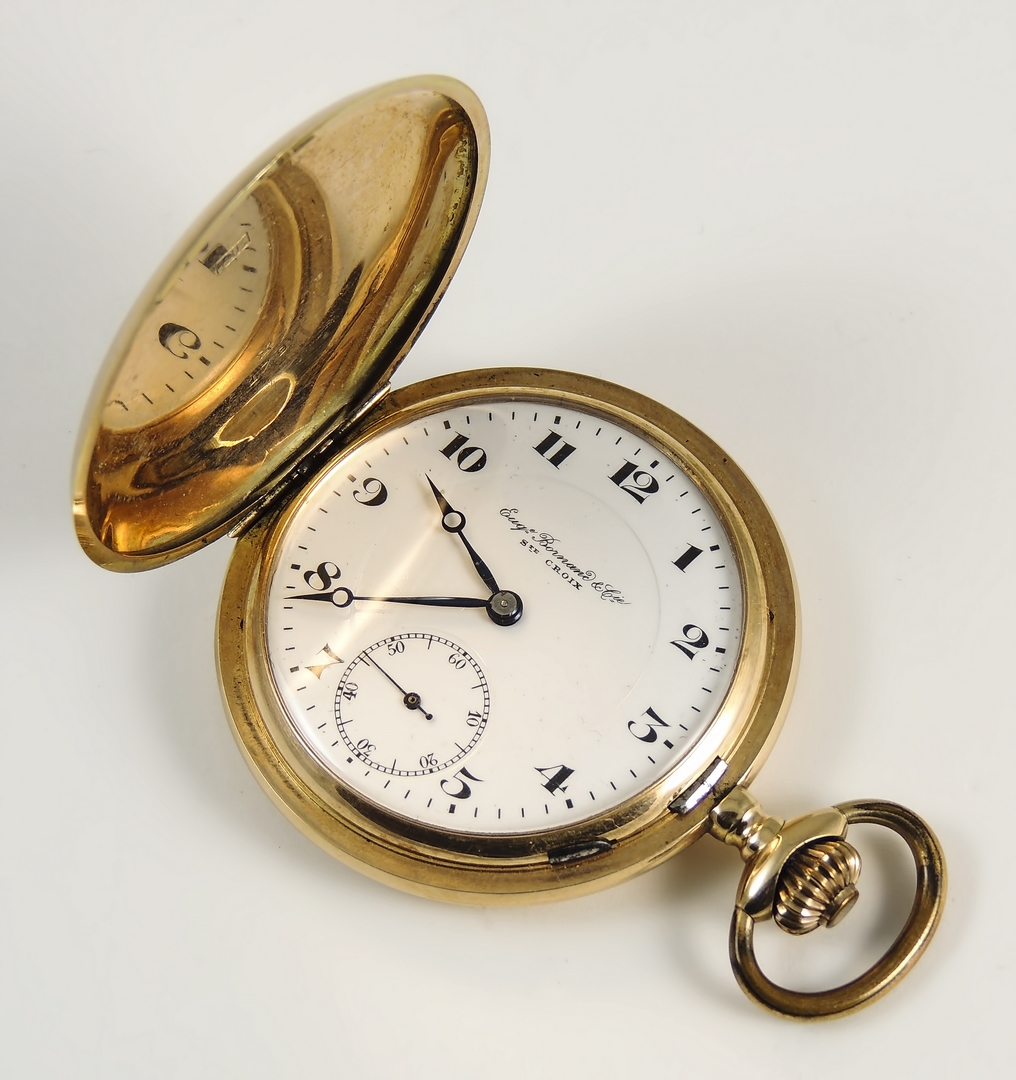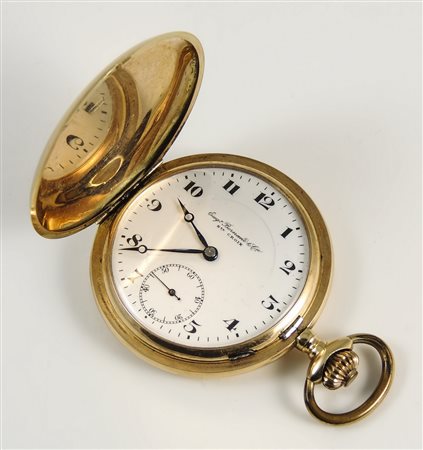 OROLOGIO DA TASCA IN ORO GIALLO 12 KT E Bornand quadrante in smalto con numeri arabi
