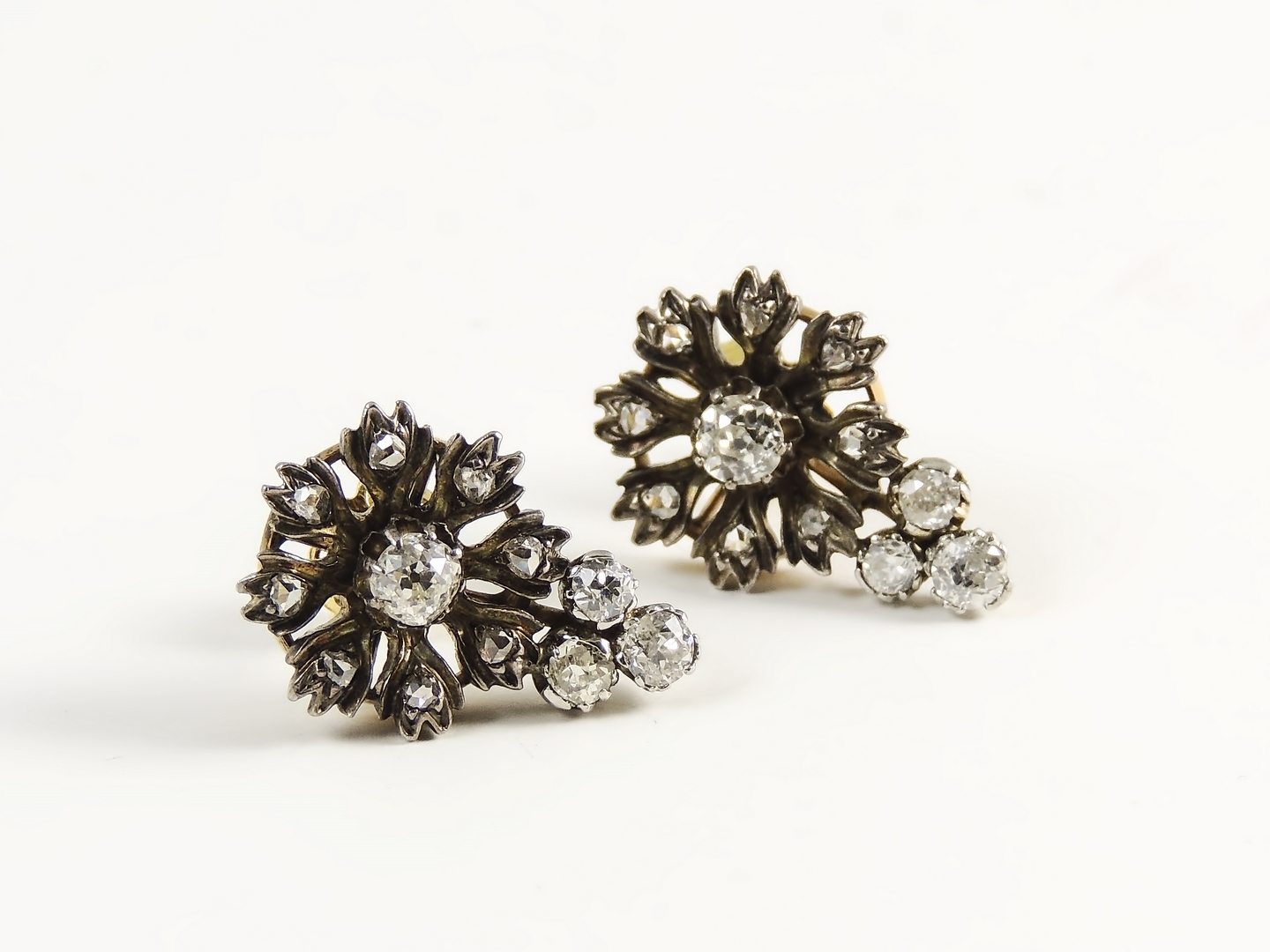 PAIO DI ORECCHINI IN ORO, ARGENTO E DIAMANTI fine del XIX secolo realizzati come un fiore con al centro diamante taglio vecchio