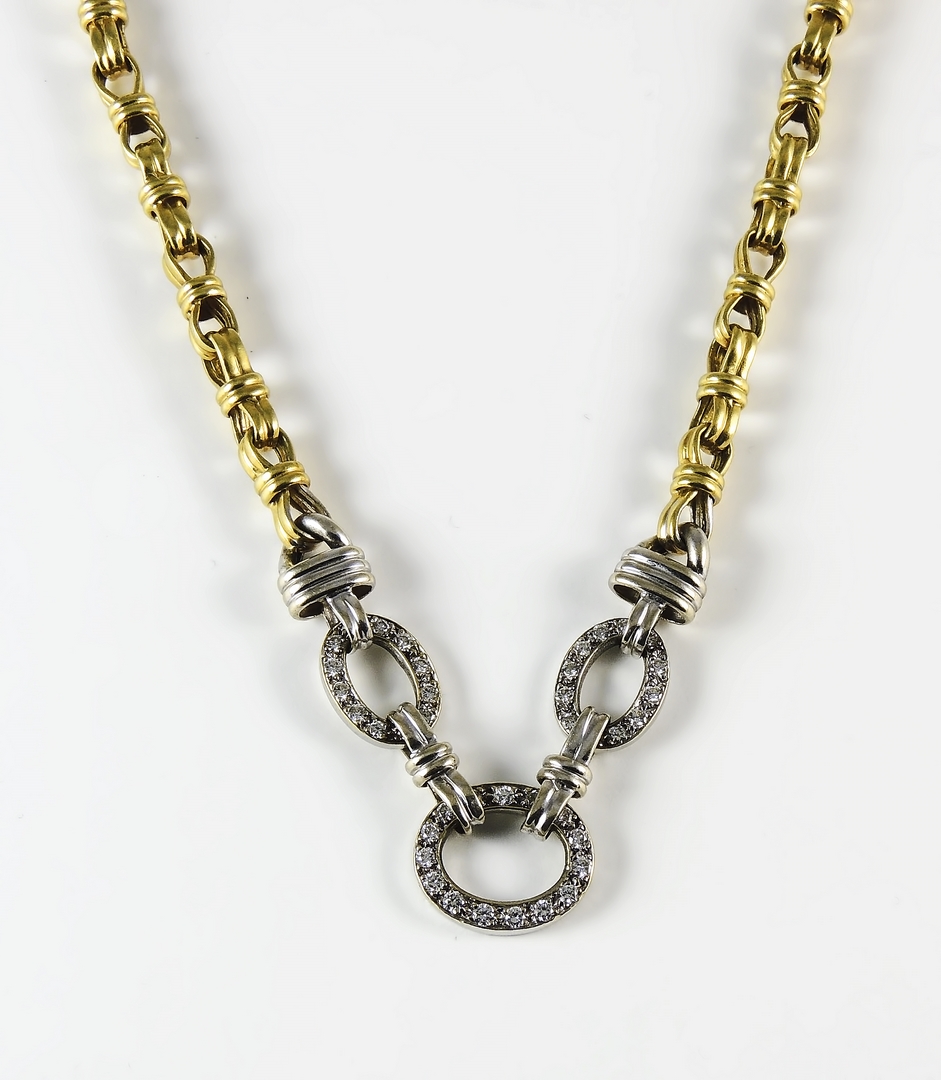 GIROCOLLO IN ORO GIALLO, BIANCO E BRILLANTI Anni Ottanta al centro placca con tre ovali impreziositi da brillanti alternati da placchette, catenina realizzata come fiocchi stilizzati gr 70,0