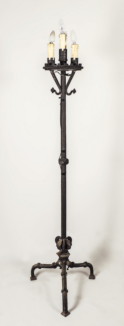 COPPIA DI GRANDI TORCIERE IN FERRO BATTUTO stelo quadrato centrato da nodo, finale a corona con tre luci, su tripode h cm 170