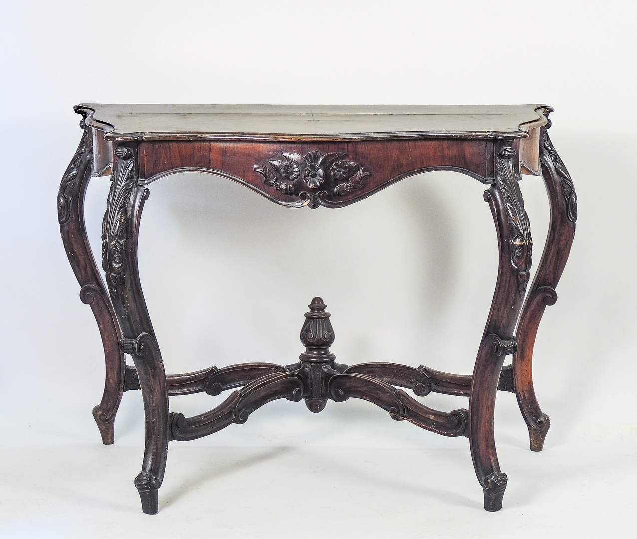 COPPIA DI CONSOLE IN MOGANO metà del XIX secolo piano sagomato, pendaglina intagliata con motivi floreali, sostegni anteriori mossi con piedi a ricciolo riuniti ai sostegni posteriori da traversa a crociera sormontata da pinnacolo, difetti h cm 84x107x60