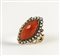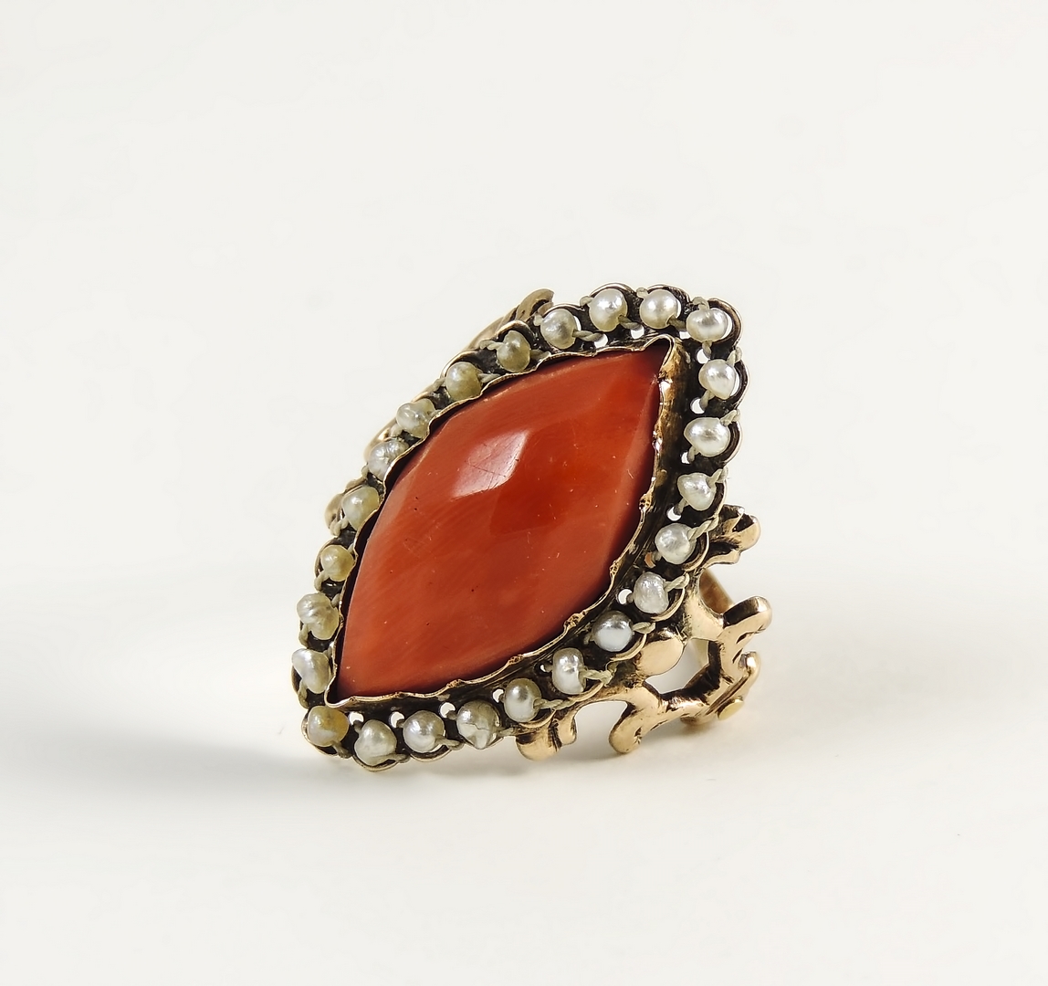 ANELLO A LOSANGA IN ORO 9 KT, CORALLO E PERLINE NATURALI fine del XIX secolo, con al centro corallo cabochon incorniciato da perline