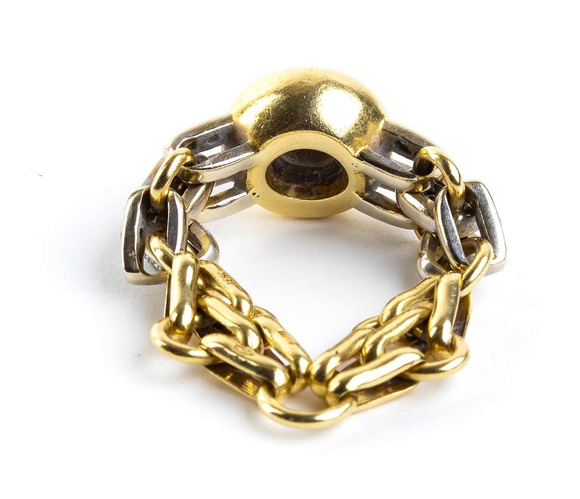 oro giallo ed oro bianco 18k, incastonato con diamante rotondo taglio brillante 1,50 ct circa, G-H. VS2. maglie dell'anello decorate con 26 piccoli diamanti taglio brillante 0,26 ct circa, G-H, VS.