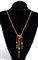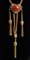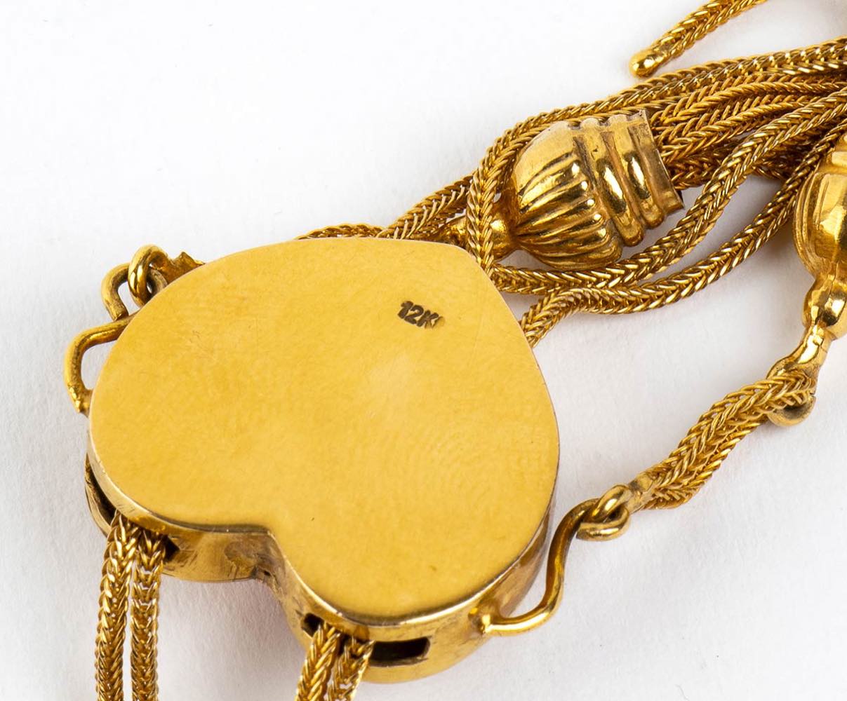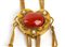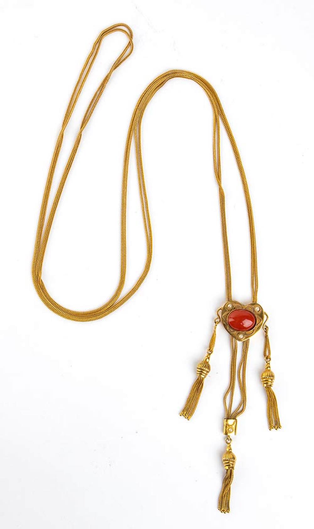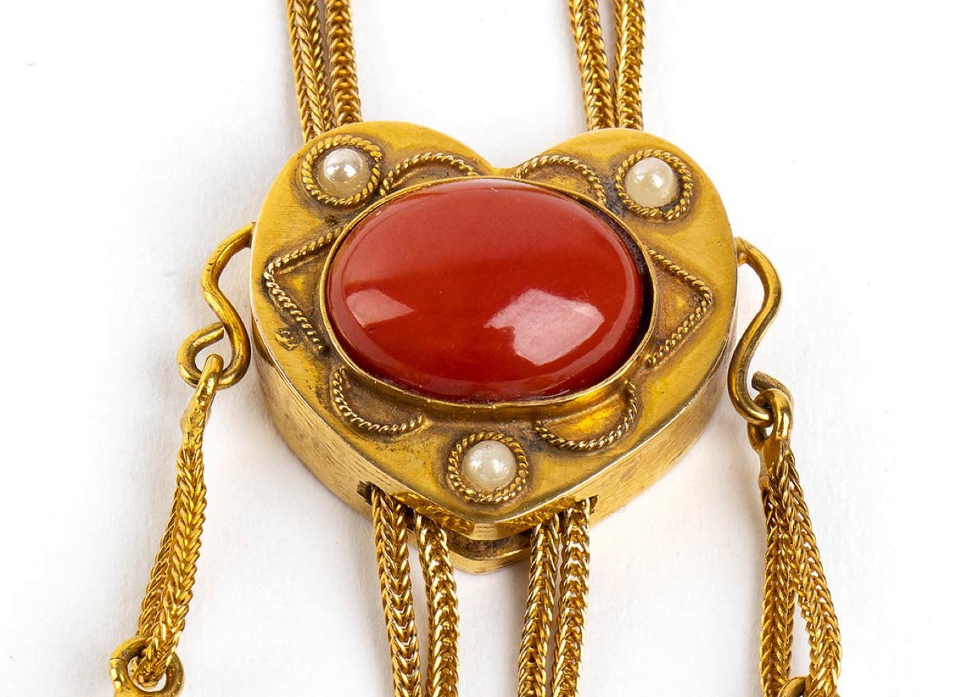 oro giallo 12K, con lunga catena in maglia a "coda di volpe", centrale a forma di cuore, con decori in motivi a cordonetto, cabochon di corallo Mediterraneo (corallium rubrum) e perle d'imitazione, da cui partono 2 pendenti con nappe decorative laterali.