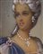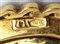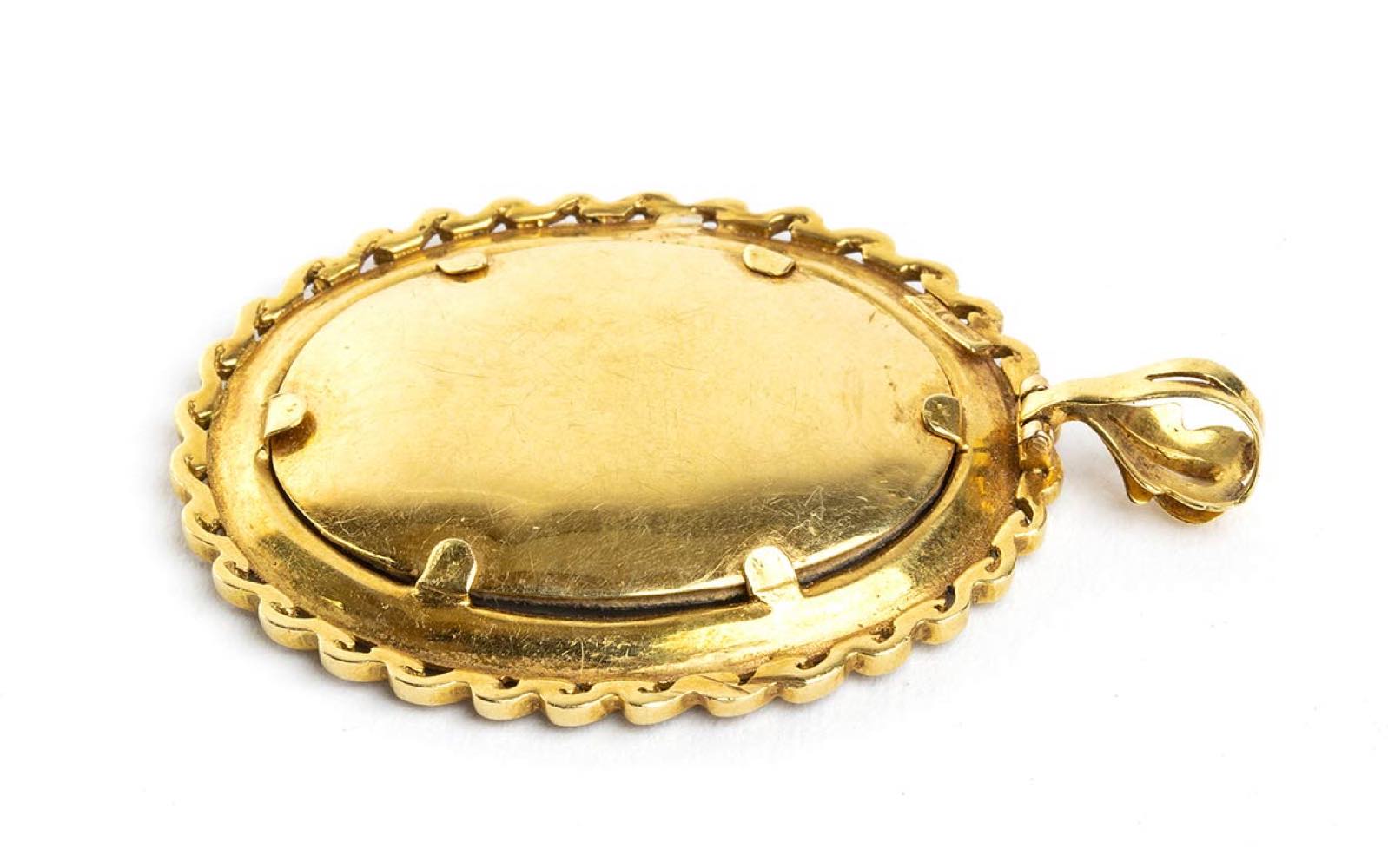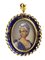 oro giallo 18k, con miniatura di una donna elegantemente ornata in cornice decorata a smalti con motivi floreali.