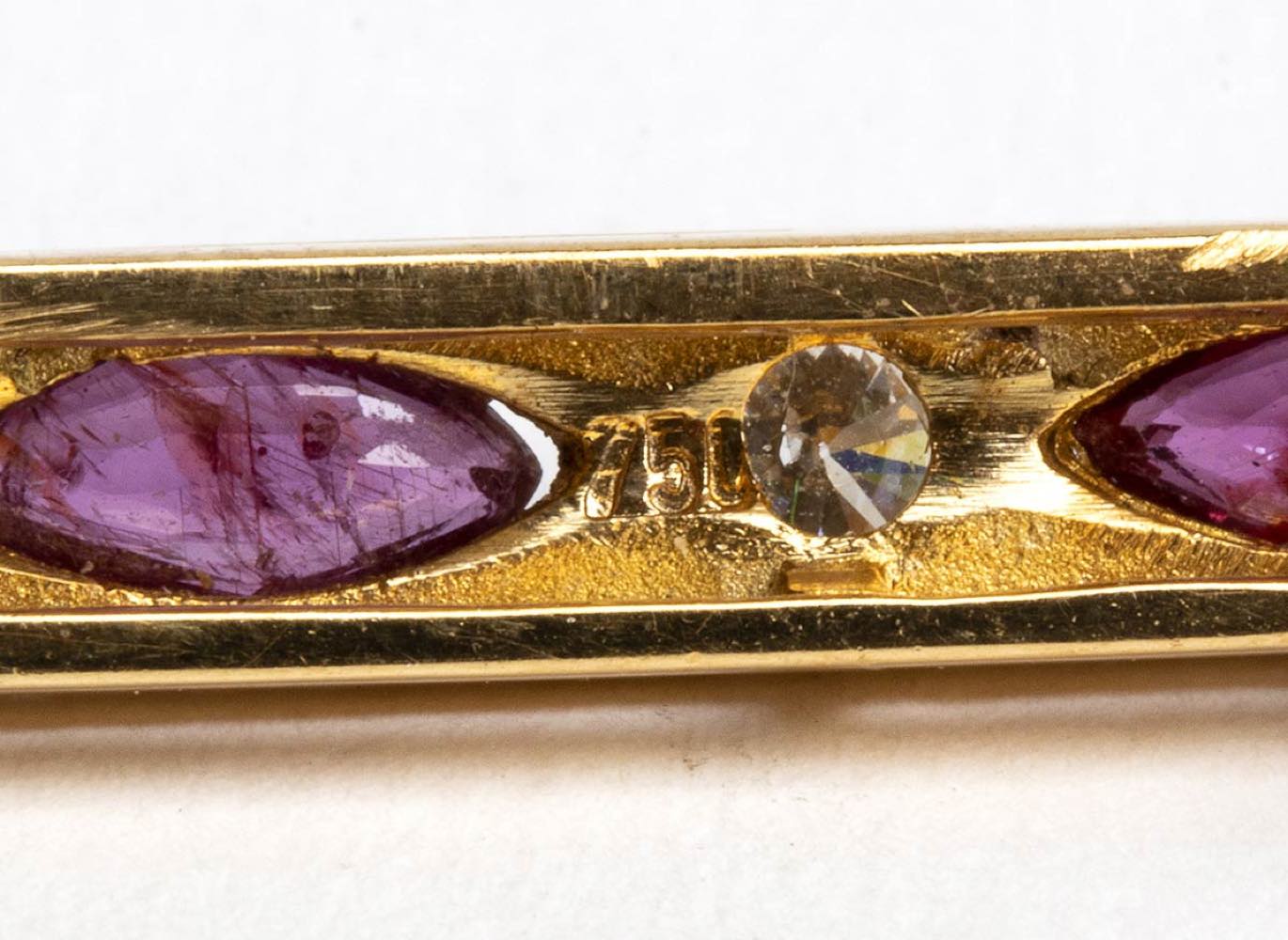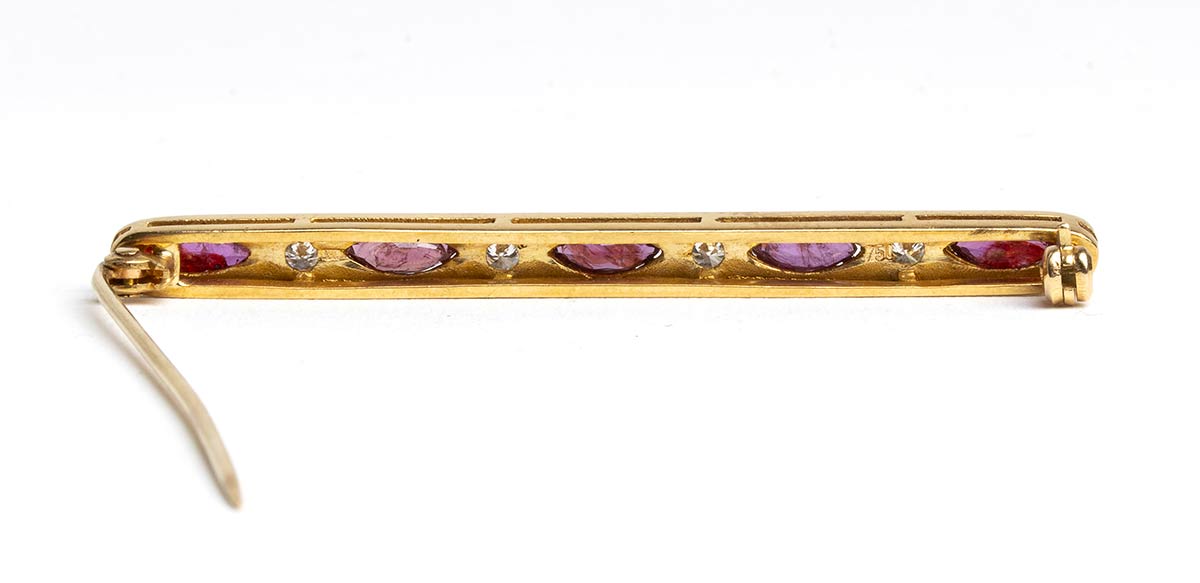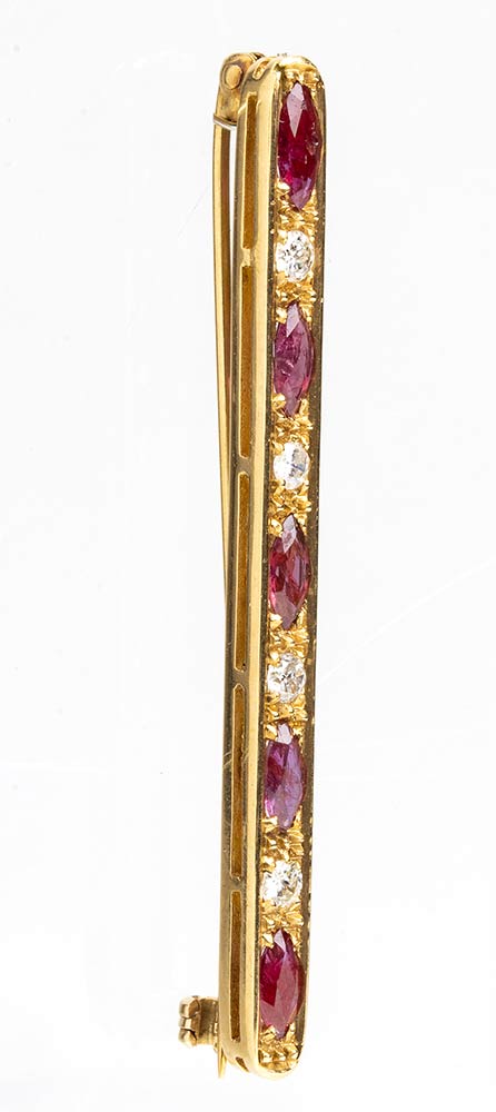 oro giallo 18k, incastonata con linea di rubini a navetta 0,75 ct circa, alternati a diamanti rotondi taglio brillante 0,40 ct circa, G-H, VS-SI. Punzonato "750".