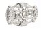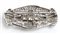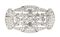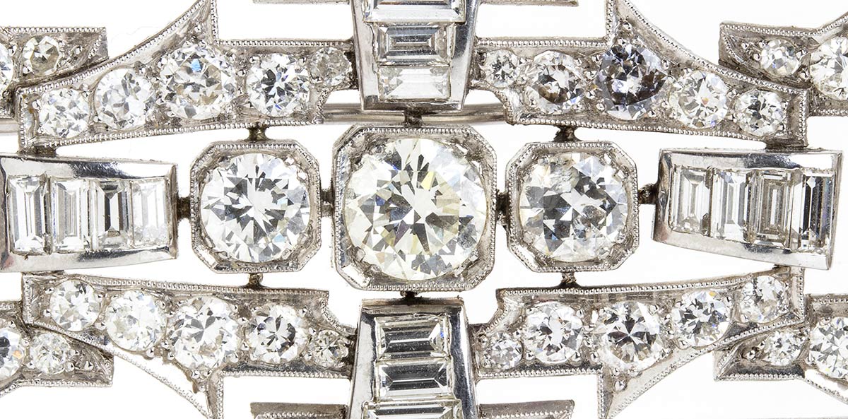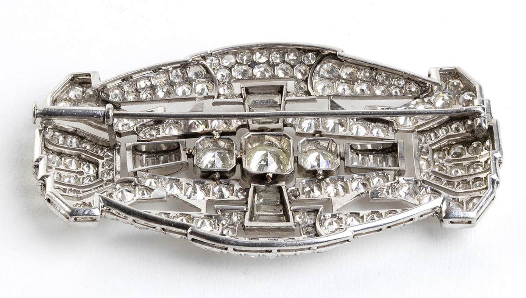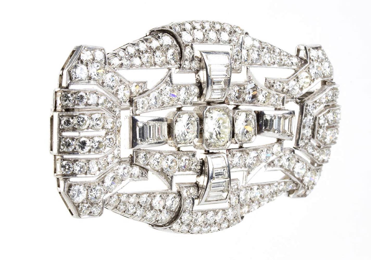 di forma geometrica a lastra traforata con motivo di nastri in diamanti. Al centro tre diamanti taglio brillante, rispettivamente: un diamante rotondo taglio brillante 1,25 ct circa, I-J, VS; un diamante rotondo taglio brillante 0,60 ct circa, H-I, VS; un diamante rotondo taglio brillante 0,60 ct circa, H-I, I1. altri diamanti di taglio baguette, rotondi taglio brillante e taglio huit-huit per totali 14,00 ct circa.