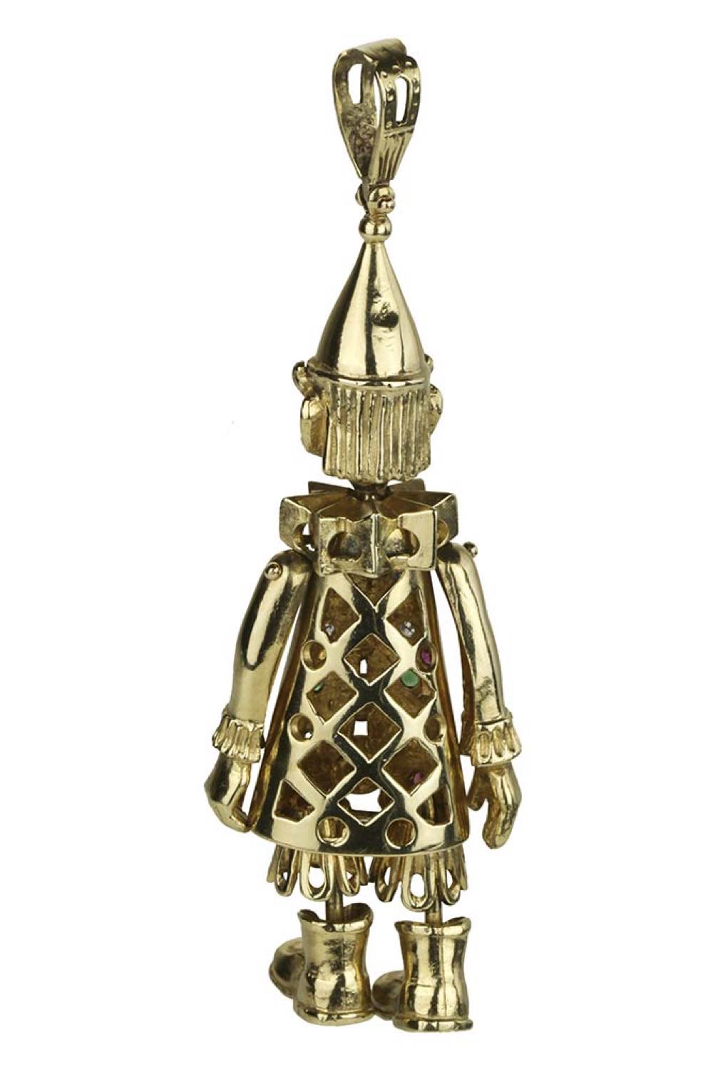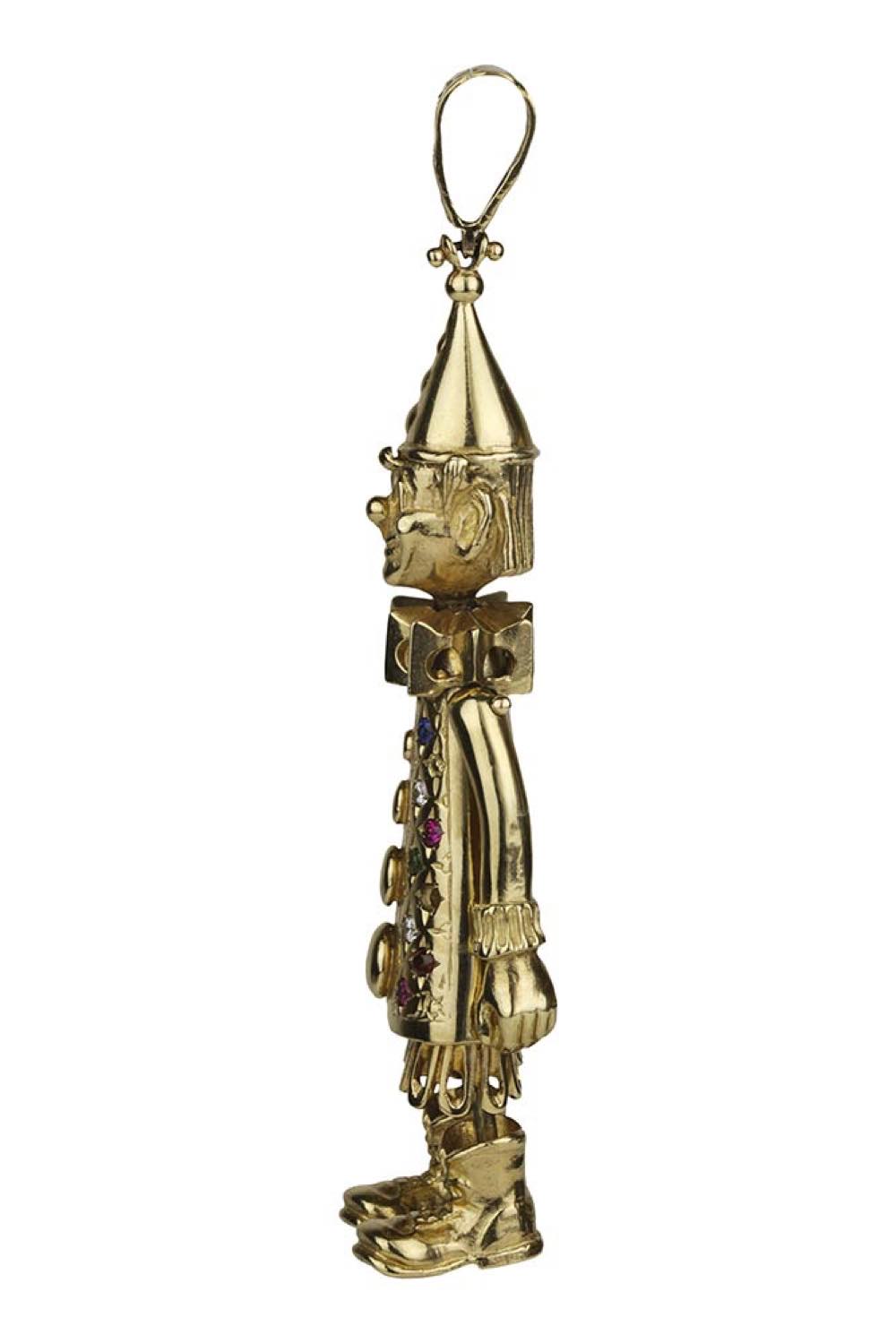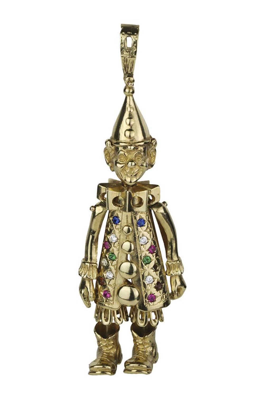 oro giallo 12k, raffigurante in "pinocchio" con testa ed arti mobili, decori in paste vitree.