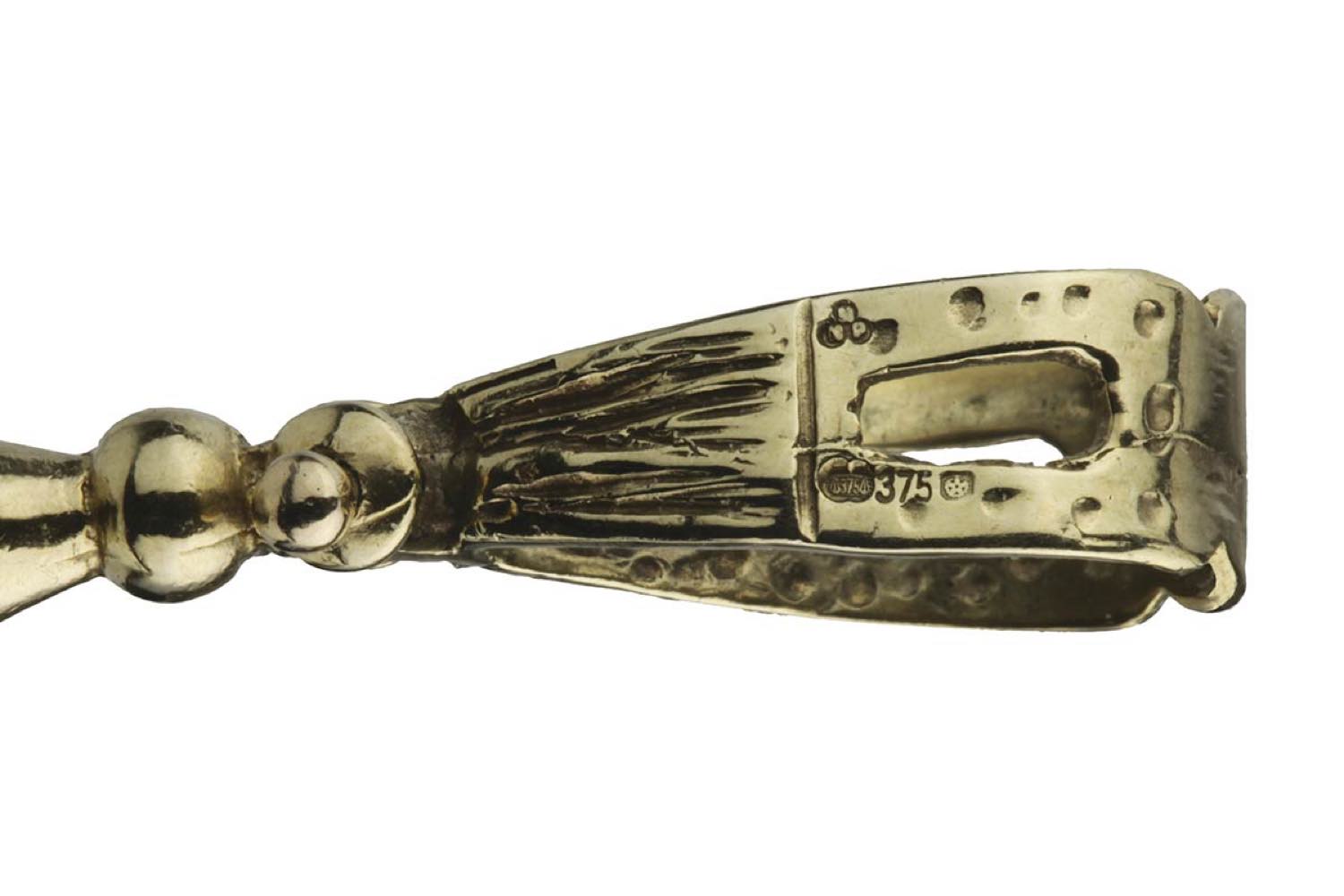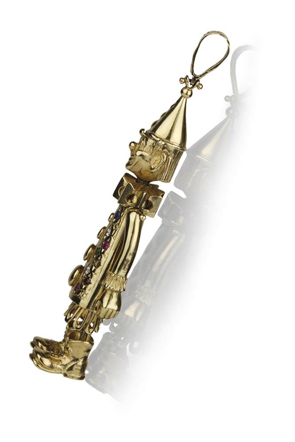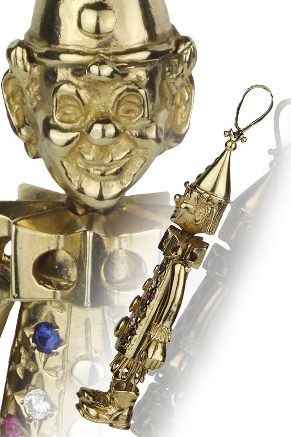 oro giallo 12k, raffigurante in "pinocchio" con testa ed arti mobili, decori in paste vitree.