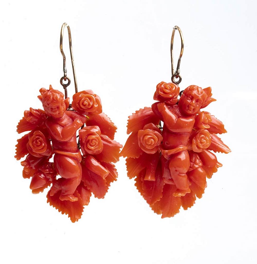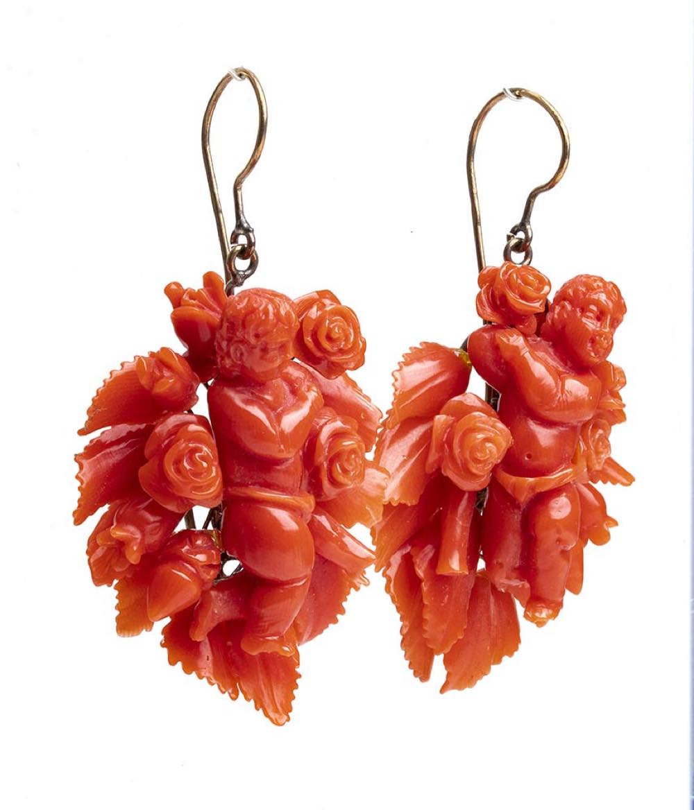 con raffigurazione di un putto tra fiori, foglie e piccoli frutti scolpiti in corallo Mediterraneo (corallium rubrum). Montaggio in oro giallo 9k.