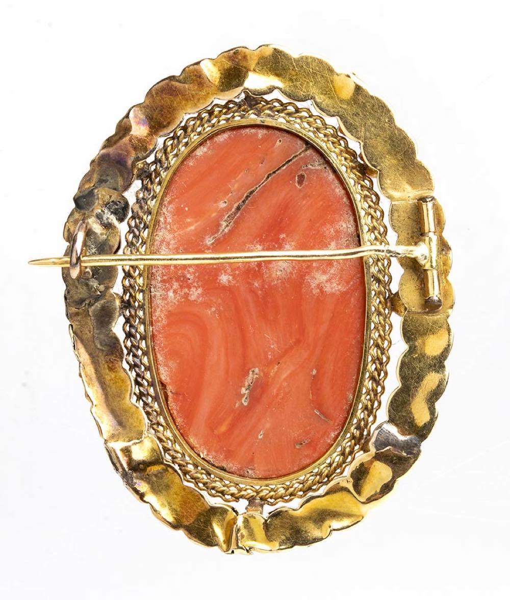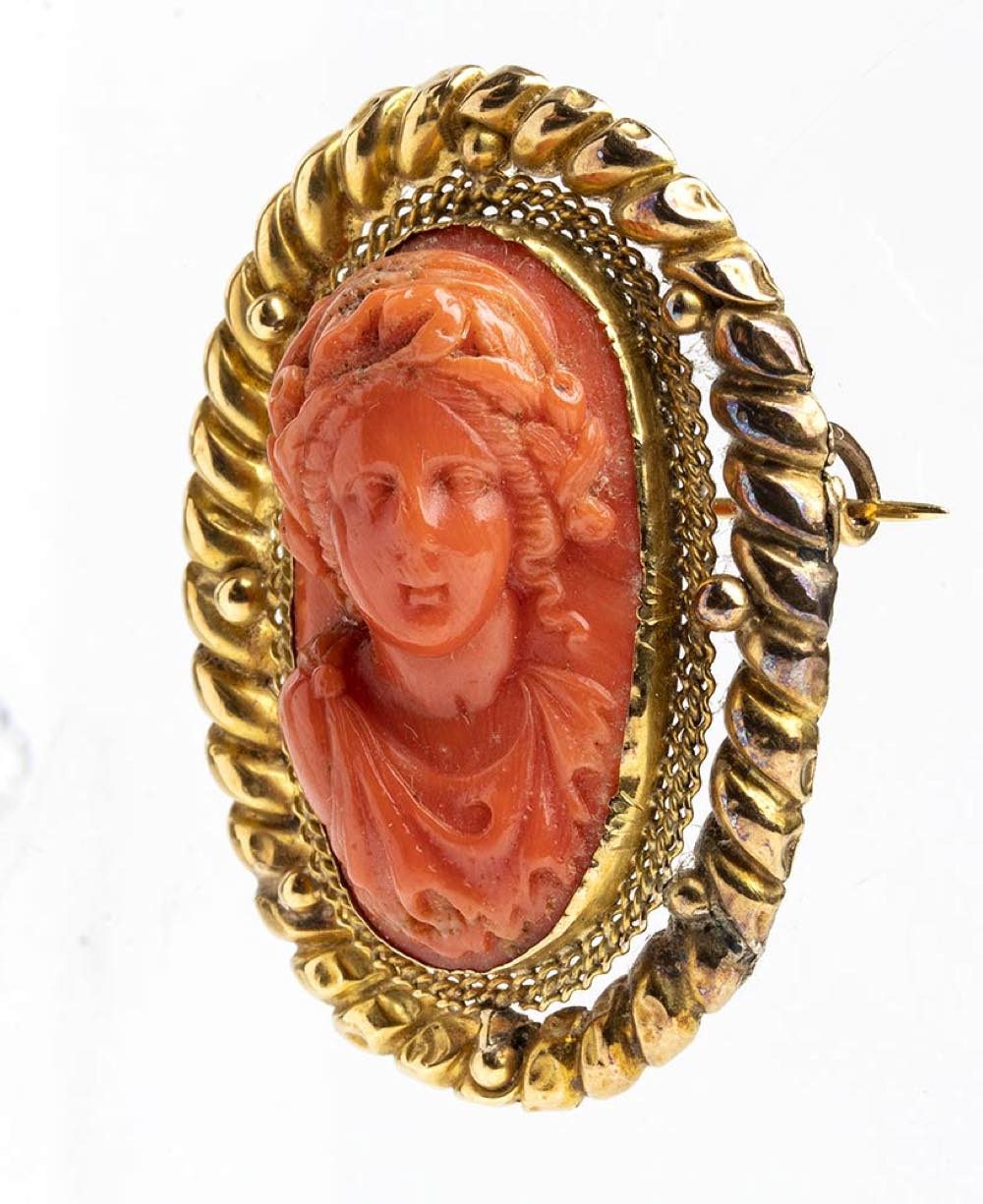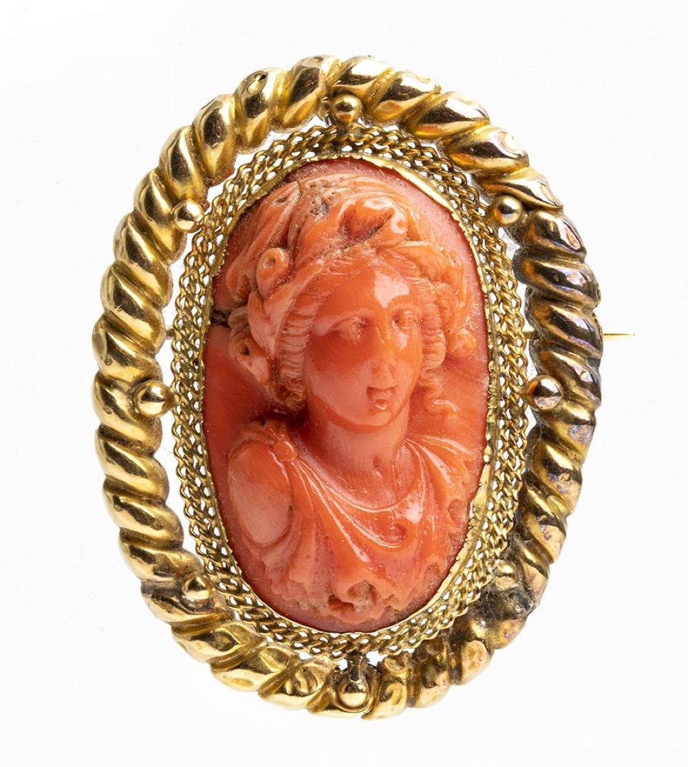 con cammeo scolpito in corallo cerasuolo (corallium elatius) raffigurante busto di donna tra cornice con motivo a cordonetto in oro 18k.
