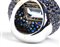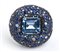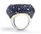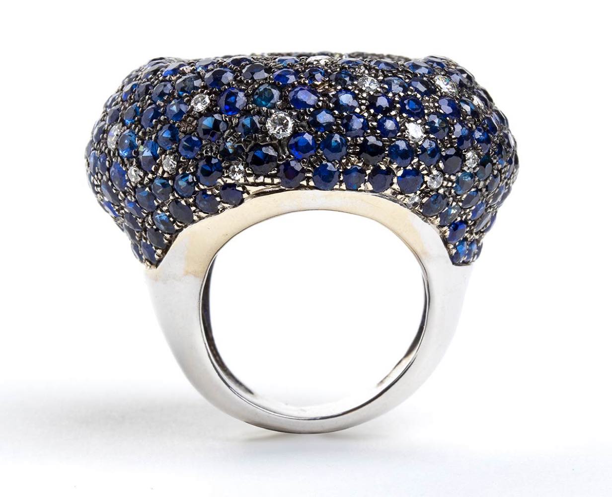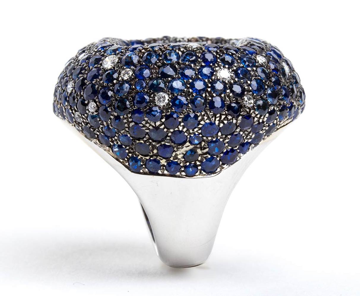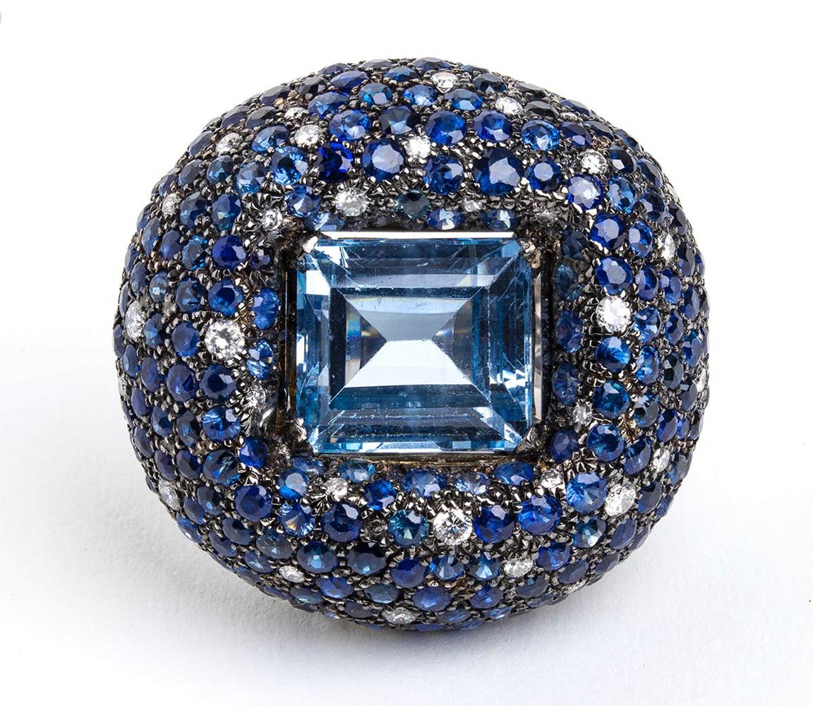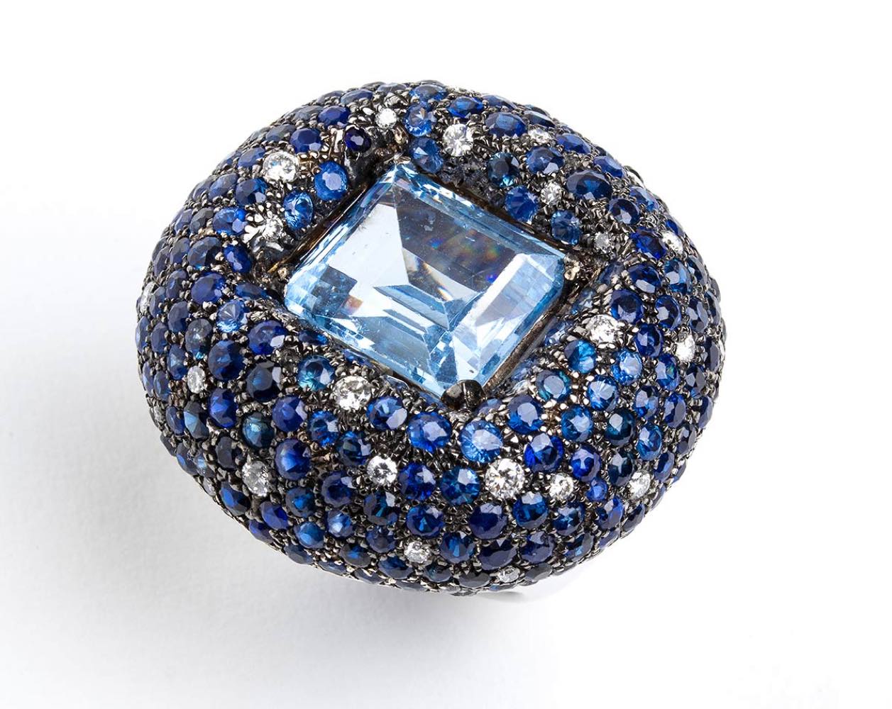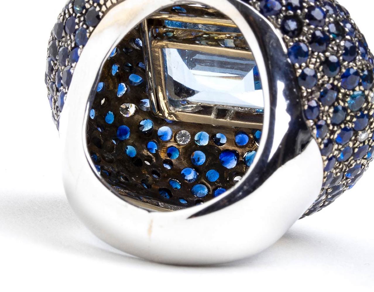 oro bianco 18k con applicazione di rutenio, incastonato con topazio azzurro 5,00 ct circa, contornato da pave" di zaffiri rotondi 30,00 ct circa e diamanti rotondi taglio brillante 1,60 ct circa, G-H, VVS.