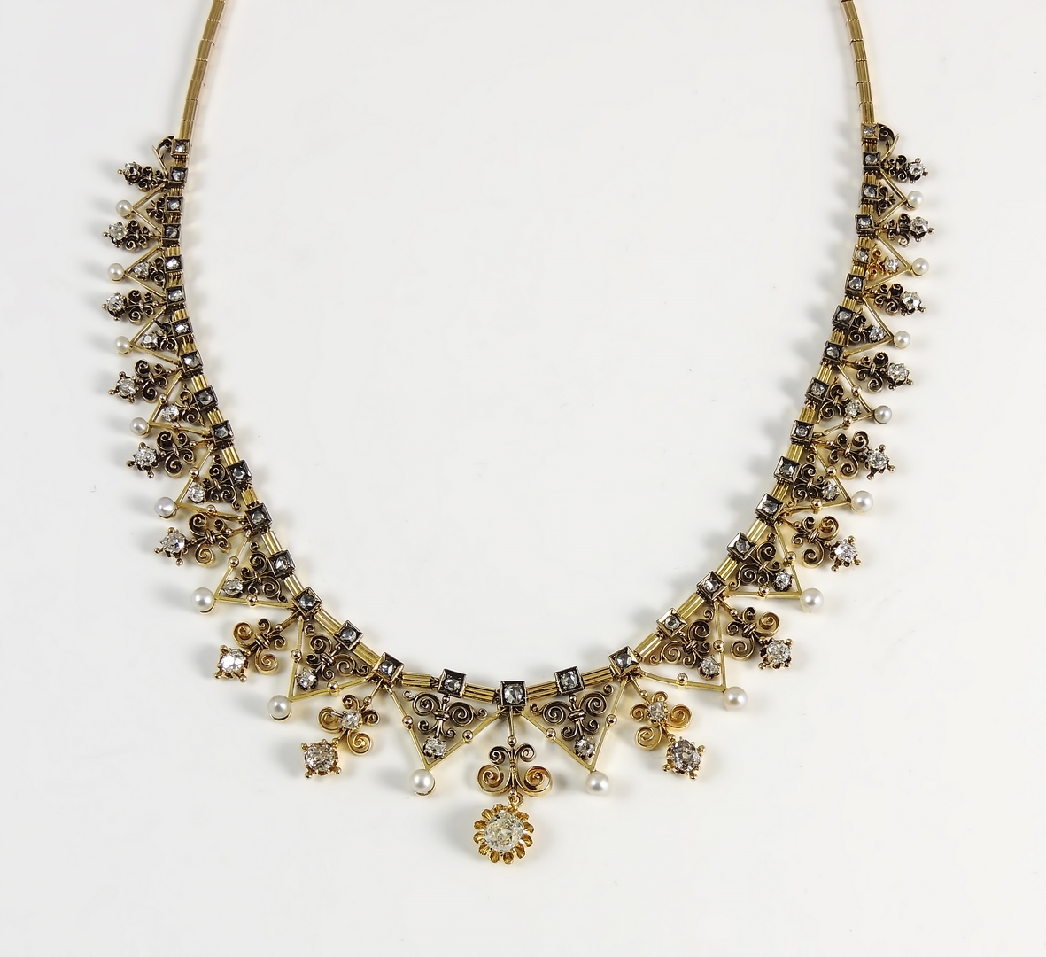 COLLIER IN ORO BIANCO 14 KT, DIAMANTI E PERLE COLTIVATE fine del XIX secolo realizzato ad imitazione del pizzo, con piccoli fiori stilizzati impreziositi da rose di diamanti e perle pendenti