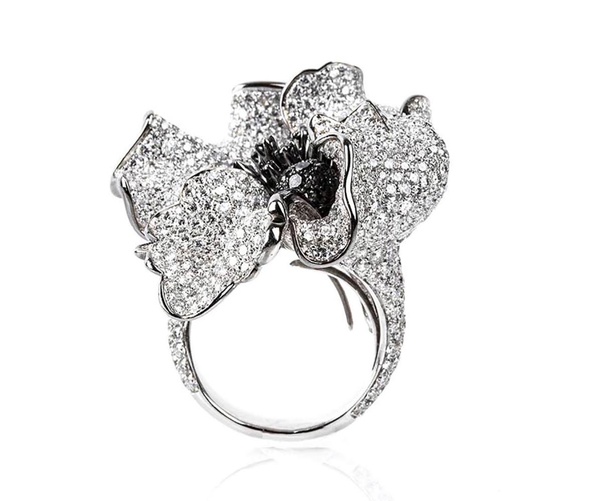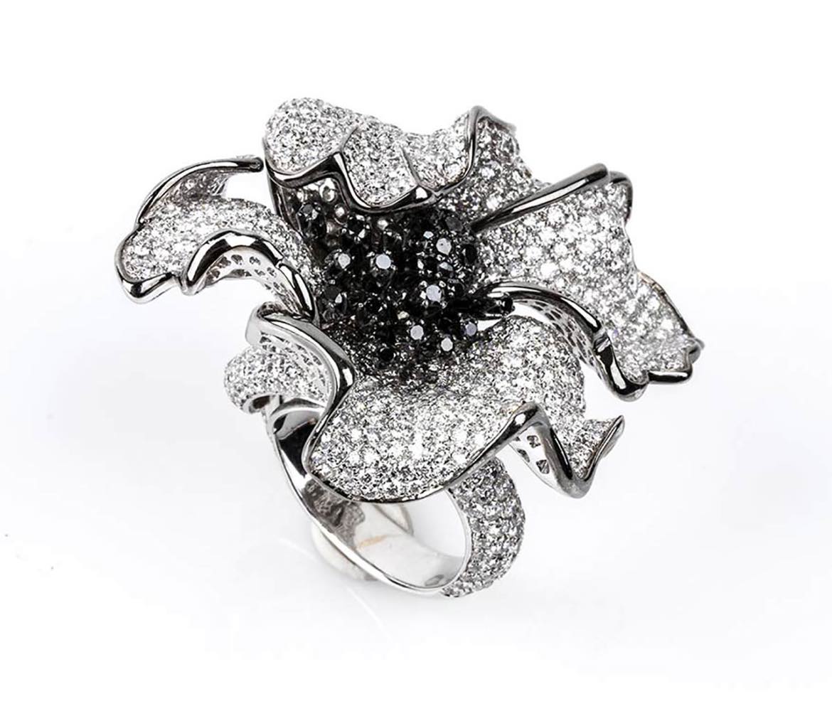 oro giallo 18k, modellato come un fiore, petali mossi impreziositi con pavé di diamanti taglio brillante 0,65 ct circa, H, VVS-VS.